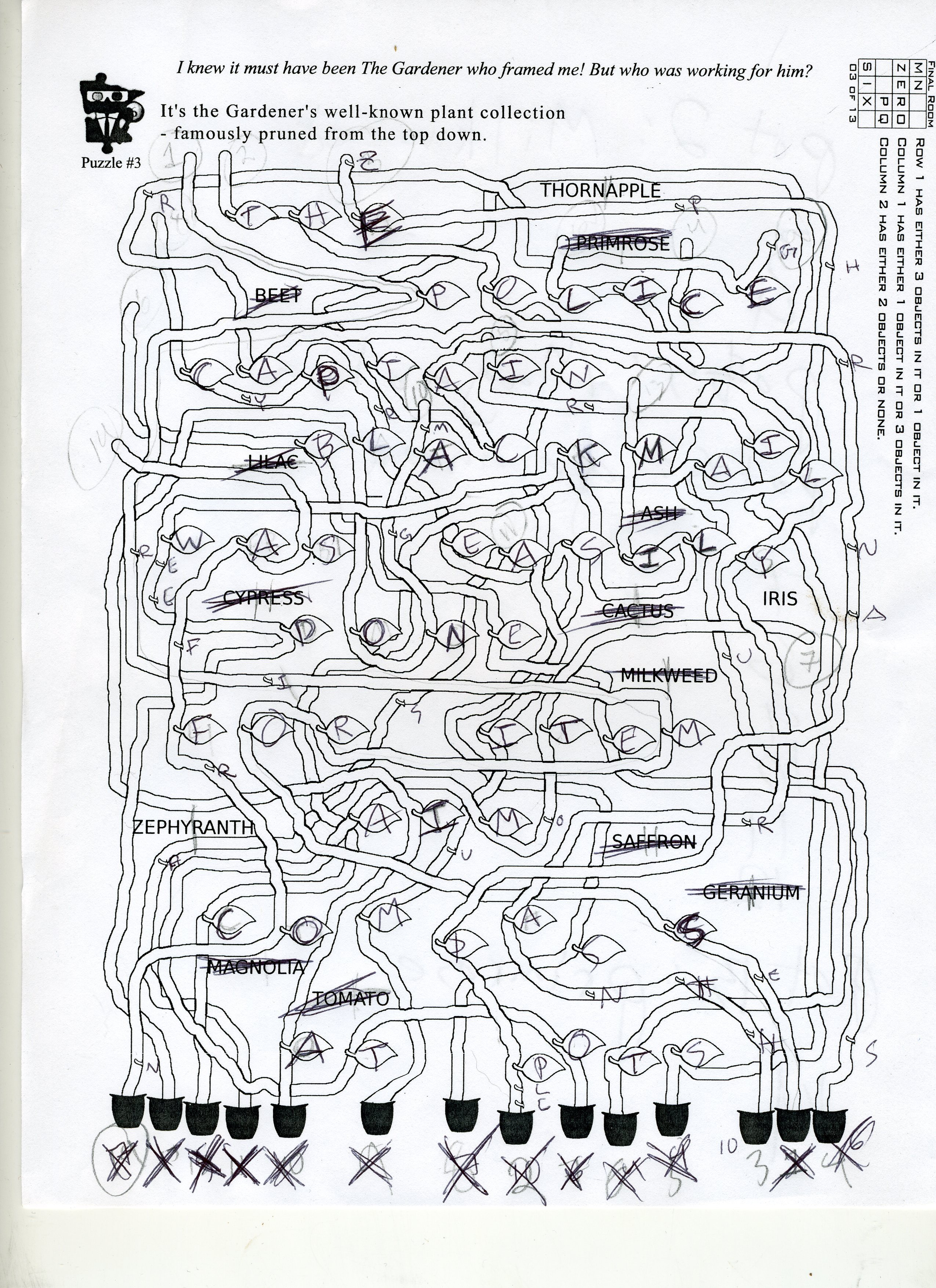 download file This puzzle was really easy for me to figure out. We caught up with most of the other groups at this point. The puzzle says: "The police captain blackmail was easily done for item aim COMPASS at pots" There were flower pots, and one of them had a clue wrapped around a big magnet, which made the compass go crazy when it was passed over it. |