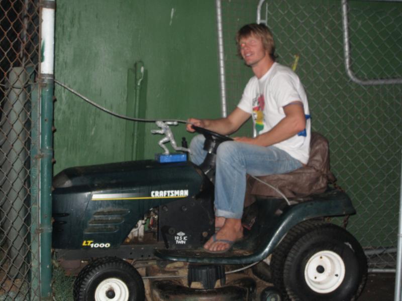 Riding a lawnmower for the win.