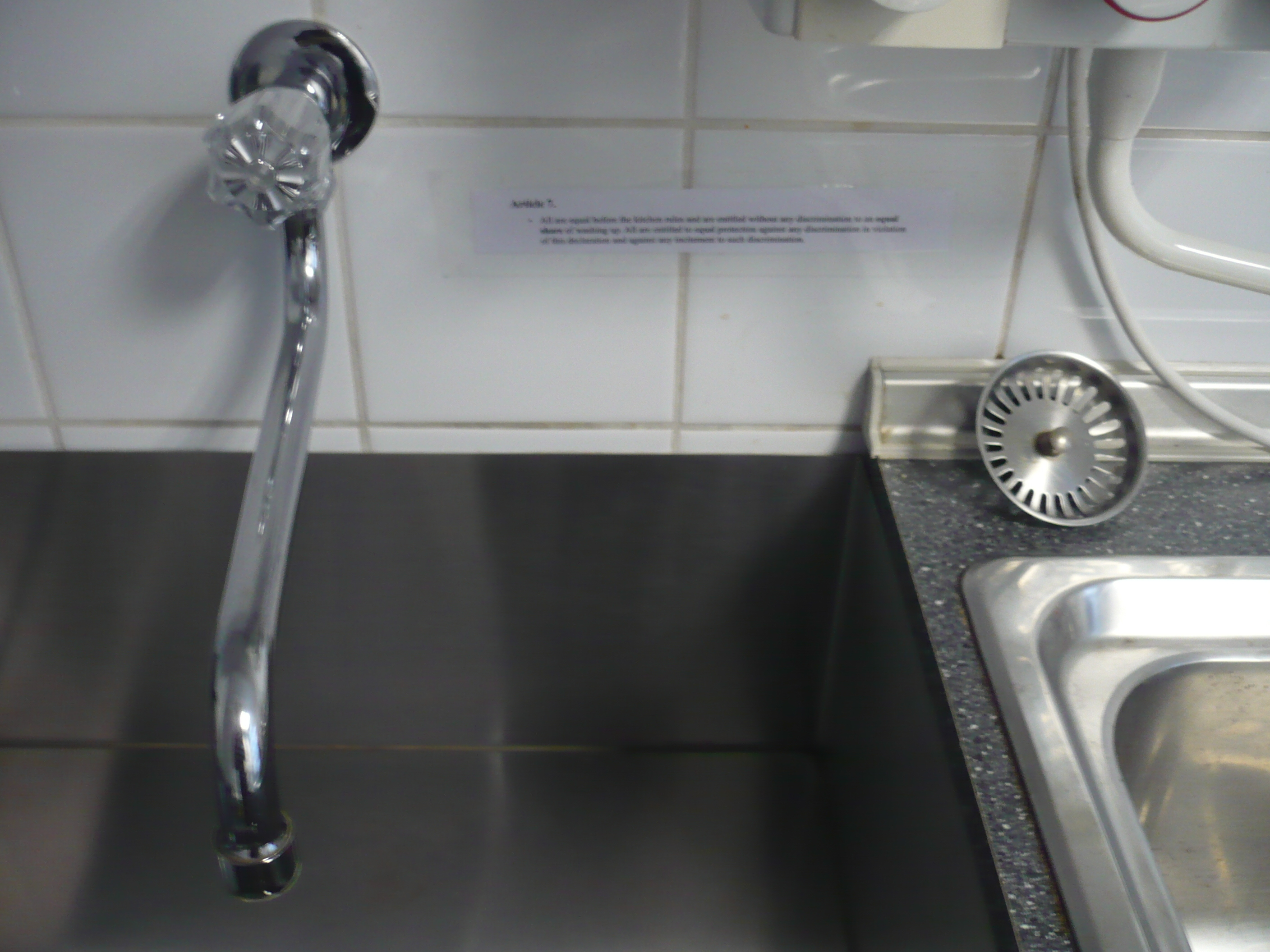 download file All are equal before the kitchen rules and are entitled without any discrimination to an equal share of washing up. All are entitled to equal protection against any discrimination in violation of this declaration and against any incitement to such discrimination. [next to the faucets] |