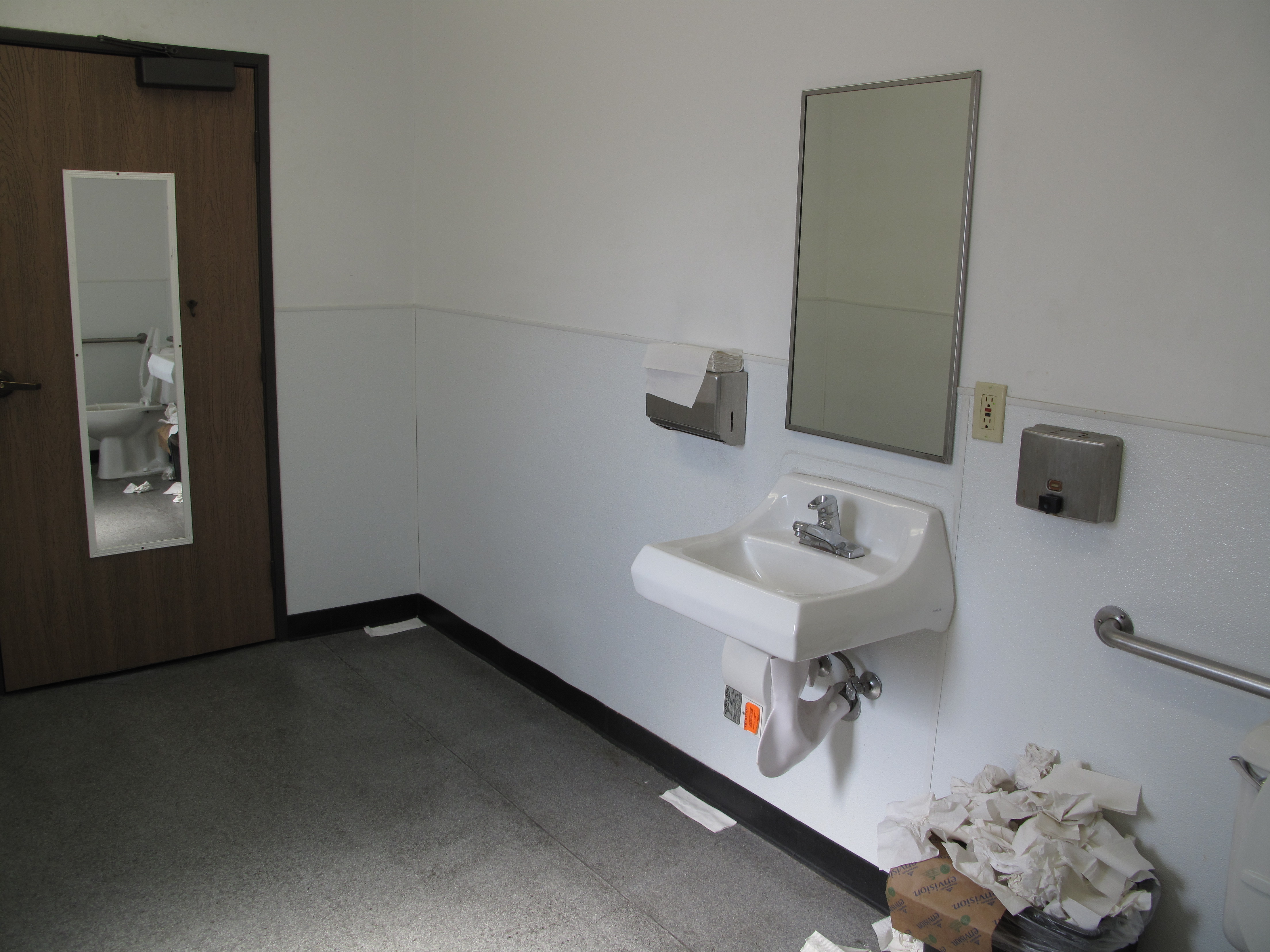 The most spacious bathroom ever also has the fullest trashcan ever as well. Kind of like a bonus.