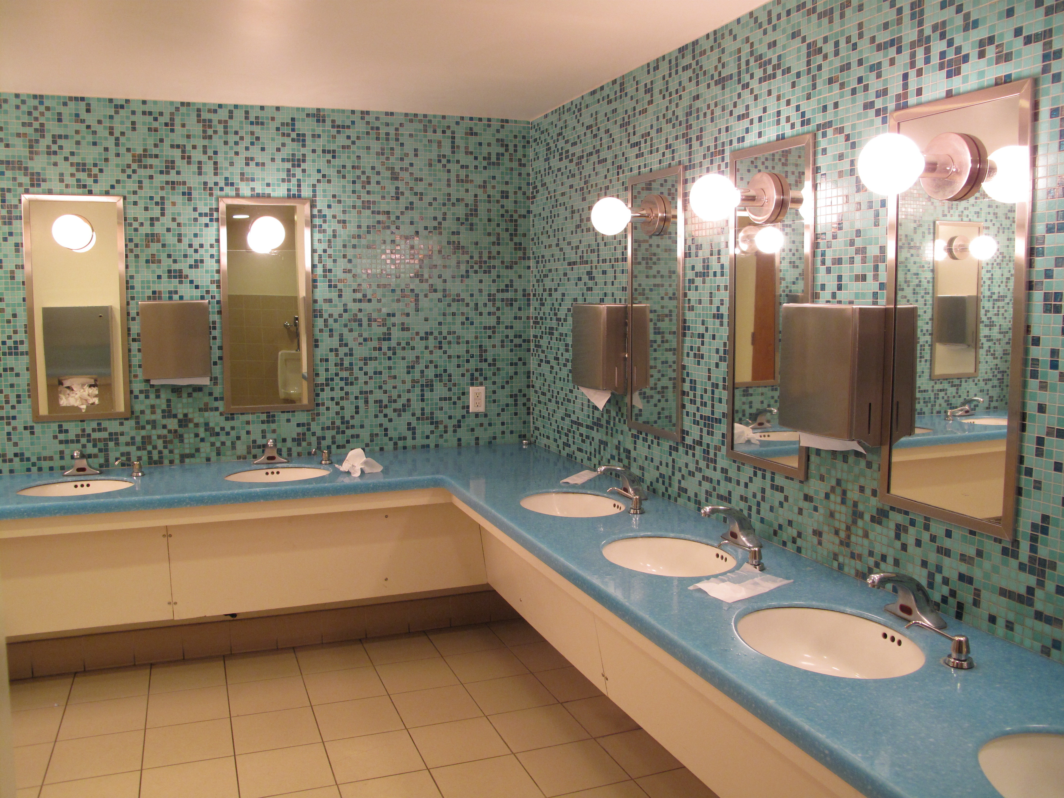 download file There is nothing I like about this bathroom. Blue countertop? Check. Tiny little aqua tiles on the walls? Check. Motion activated faucets? Check. Lights mounted in the middles of the mirrors? Check. Under-sink mounted soap dispensers? Check. |