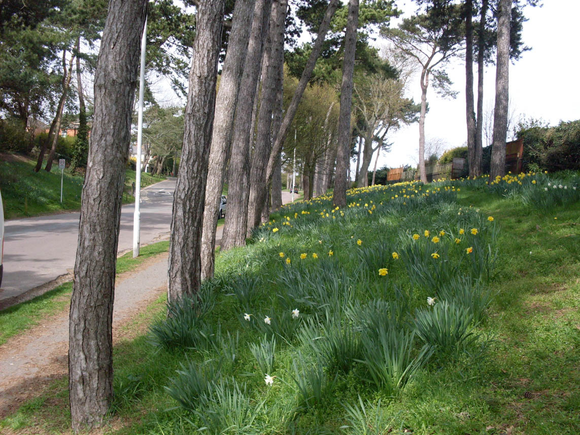 A road into King's Park, lined with trees and banks of grass with daffodils. A nice place to walk.