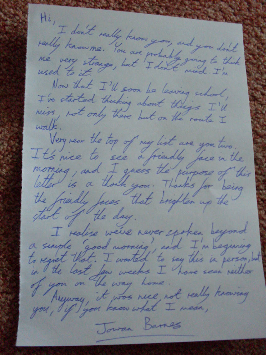 This was sent to a couple of people who I thought deserved a personal thanks. Ironically after not seeing them for a few weeks I saw one of them the same day I posted this...