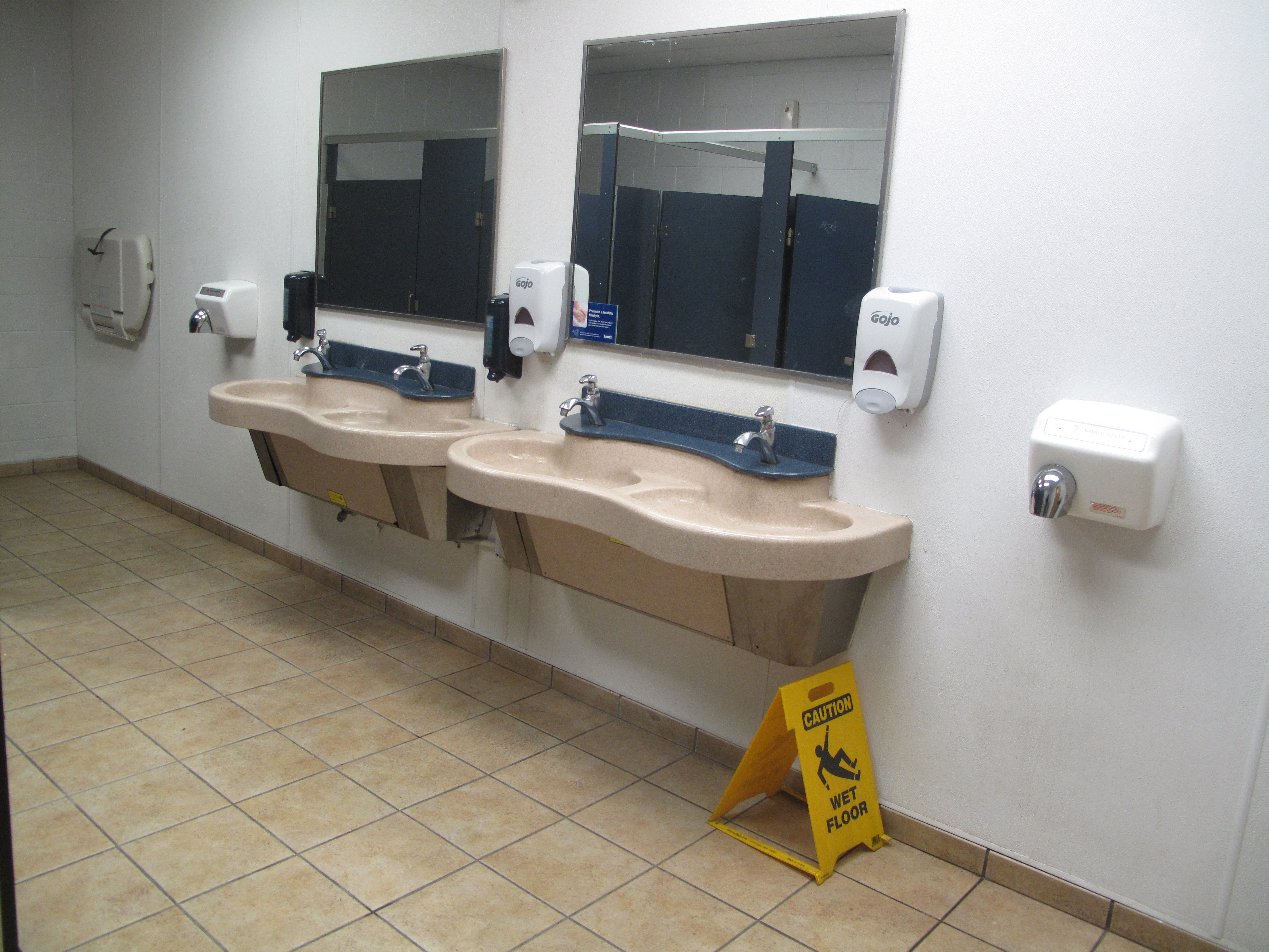 Look at them whacky sinks. Also I love the Wet Floor falling guy.