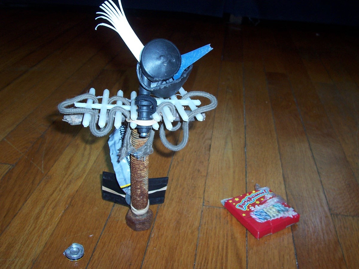 download file The marker and black plastic pieces became tail plumes. The blue shard makes an excellent beak. To give the illusion of feathers, I cut strips into the plant care tag and draped the shoestring from the wings. The wings and head needed a tad more support, so I used the hair band and a small stick. |