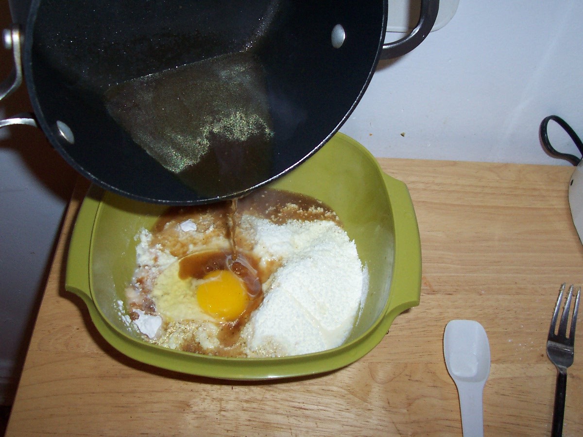 Add broth to other ingredients: 2 1/2 cups flour, 3/4 cup dry milk powder, 1/2 cup vegetable oil, 2 tbs brown sugar, 1/2 cup shredded carrots, 1 egg.