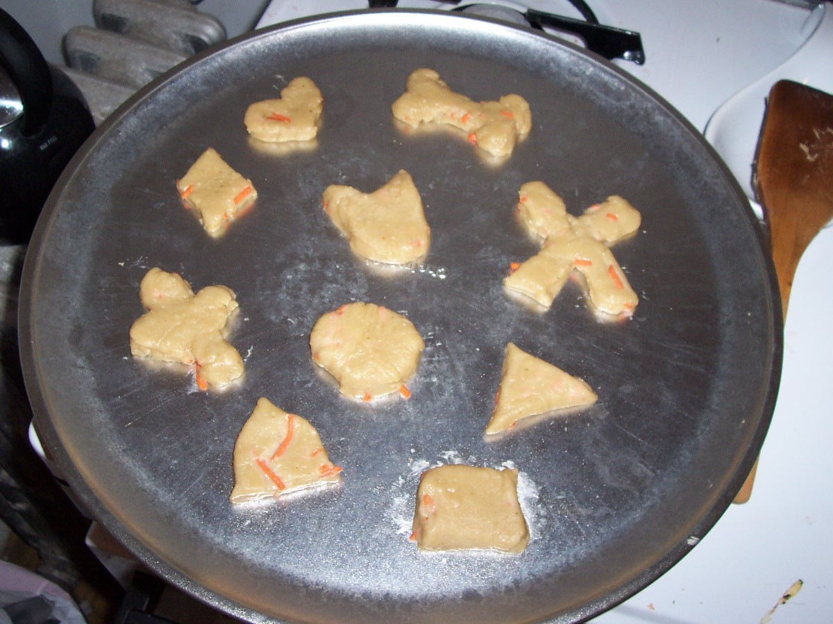 Here's where I ran into a tiny obstacle. I didn't have cookie cutters or cookie sheet. Instead I cut these shapes out with a butter knife (not recommended) and laid them out on an ungreased pizza pan.
