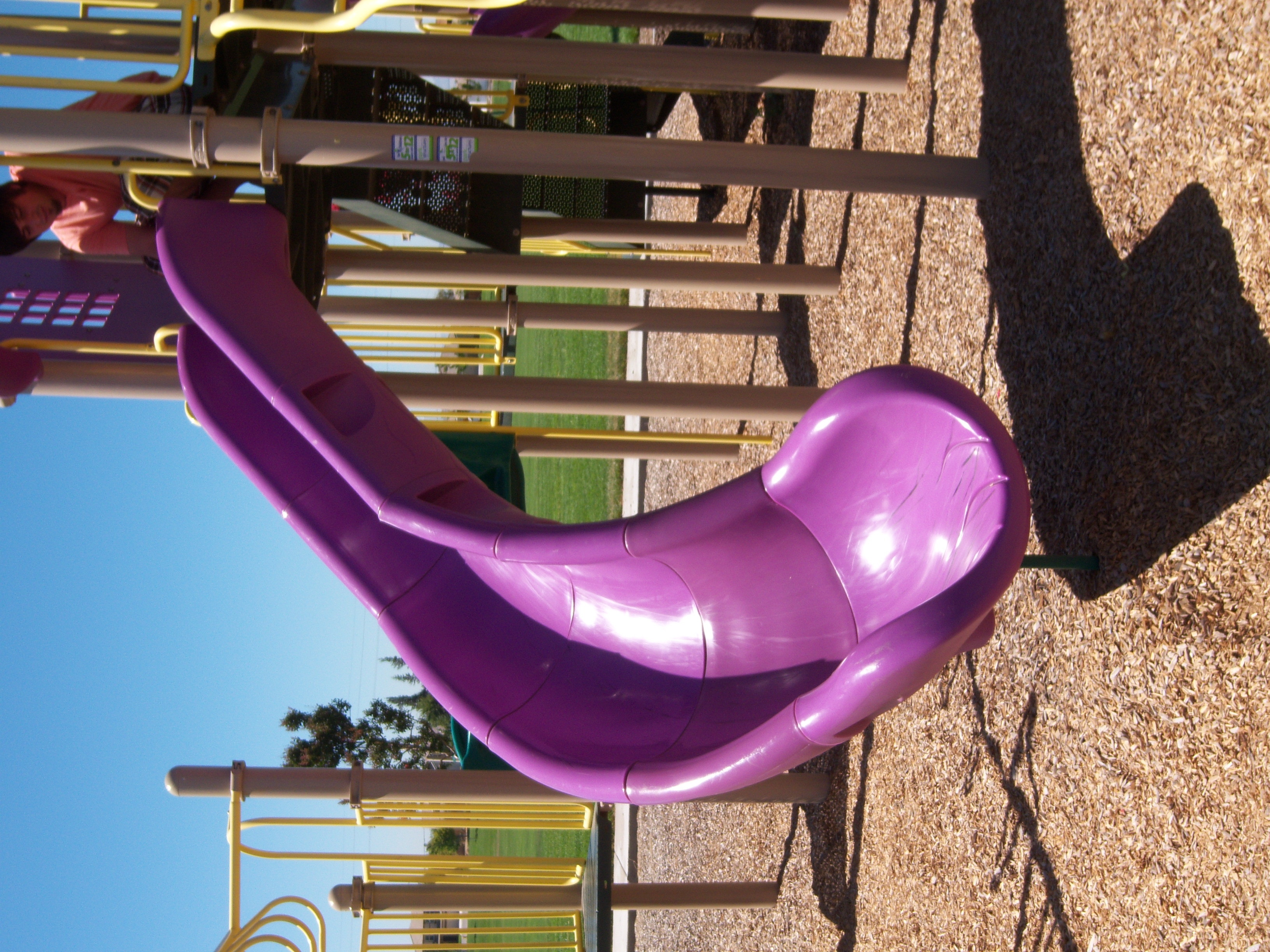 Blue car goes for a trip down the slide.