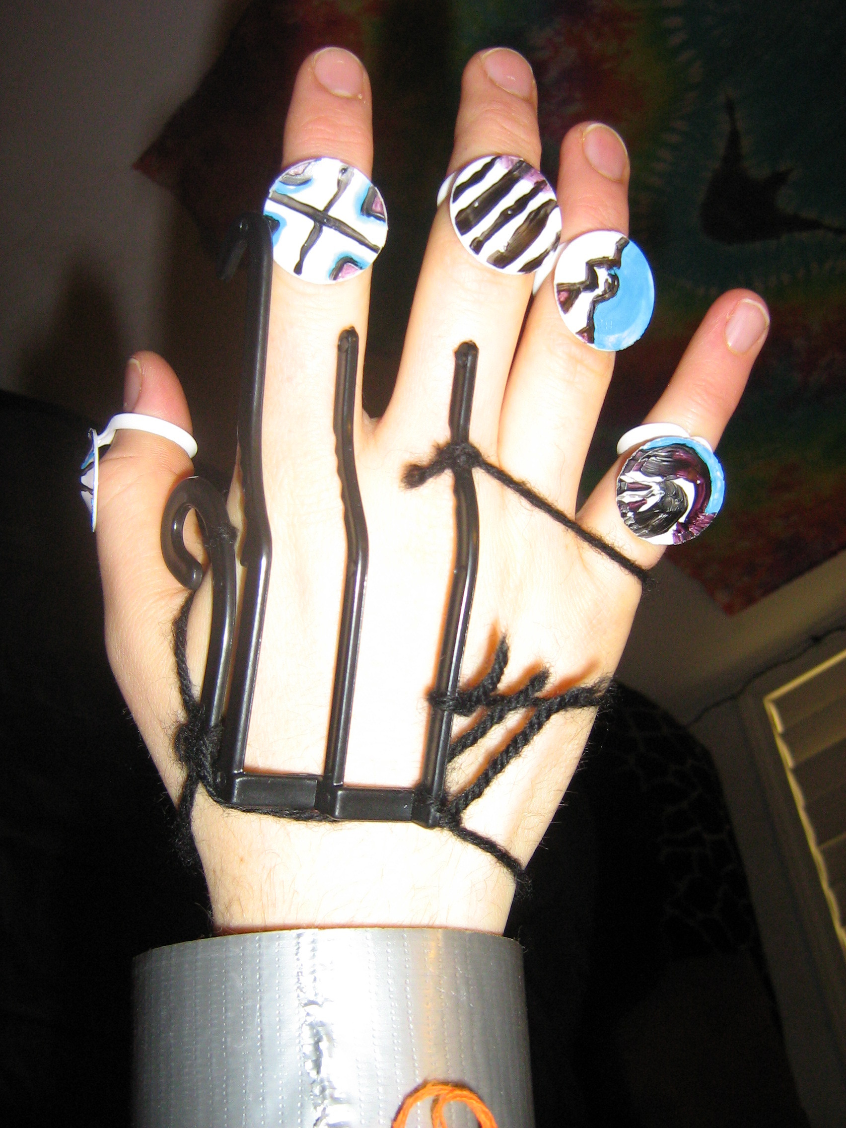 Ingredients for both hands: End of duct tape rolls, the hanger that comes with fancy socks, black yarn, the safety tops that you get at the top of cartons of liquids painted with acrylics.