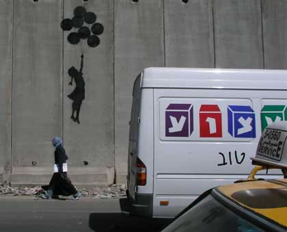 download file Banksy is a reclusive graf artist from the UK. This work he did on the walls delineating Israeli territorry from areas which could best be described as officially Palestinian but also under significant levels of settlement, was obviously not commissioned. Stuff he did just started popping up around the West Bank and Gaza. |