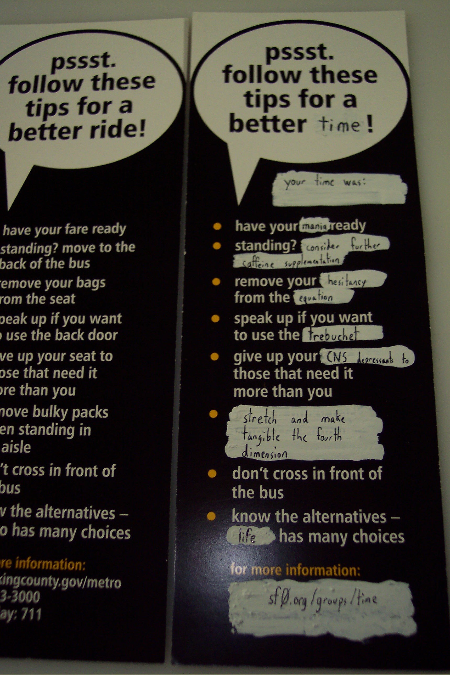 download file The front side of the brochures we handed out. These were detourned from a King County Transit brochure. The text reads: pssst. follow these tips for a better TIME! your time was: (here we put peoples' time). * have your MANIA ready * standing? CONSIDER FURTHER CAFFEINE SUPPLEMENTATION (variant: some of these, we instead said "standing? STAND FASTER) * remove your HESITANCY from the EQUATION * speak up if you want to use the TREBUCHET * give up your MOLASSES TO those that need it more than you (Variant: Some of them said "give up your CNS DEPRESSANTS" instead. side note: "Give up your molasses" is how we've started to say "hurry up" now.) * STRETCH AND MAKE TANGIBLE THE FOURTH DIMENSION. * don't cross in front of the bus * know the alternatives - LIFE has many choices for more information: sf0.org/groups/time |