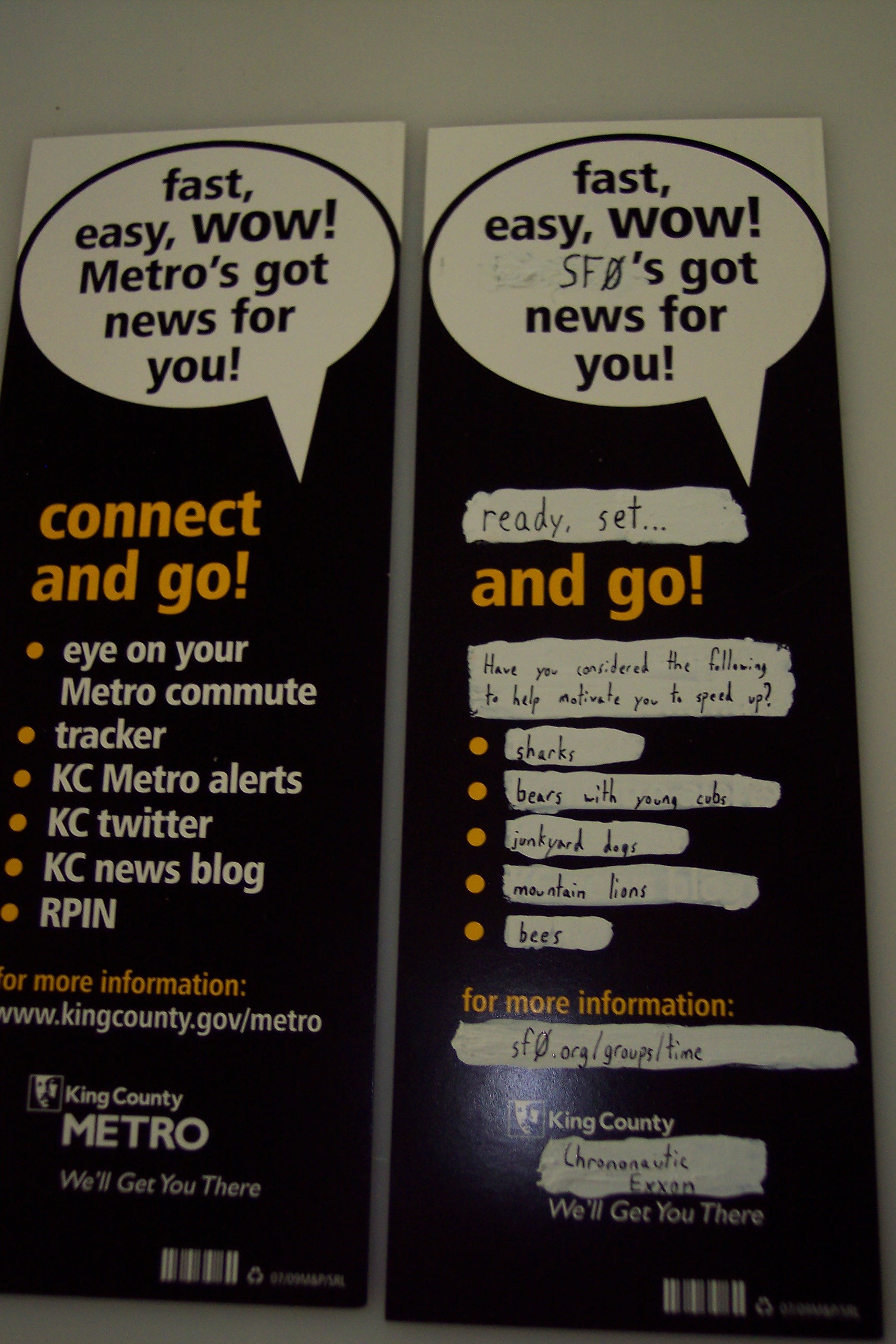 download file The front side of the brochures we handed out. These were detourned from a King County Transit brochure. The text reads: fast, easy, WOW! SF0's got news for you! ready... set... and go! HAVE YOU CONSIDERED THE FOLLOWING TO HELP YOUR SPEED? * SHARKS * BEARS WITH YOUNG CUBS * JUNKYARD DOGS * MOUNTAIN LIONS * BEES ... for more information: sf0.org/groups/time ... King County CHRONONAUTIC EXXON: We'll get you there |