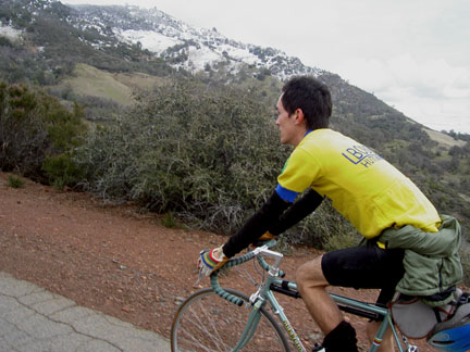 Me biking up a snowy Mt. Diablo, in the East Bay.