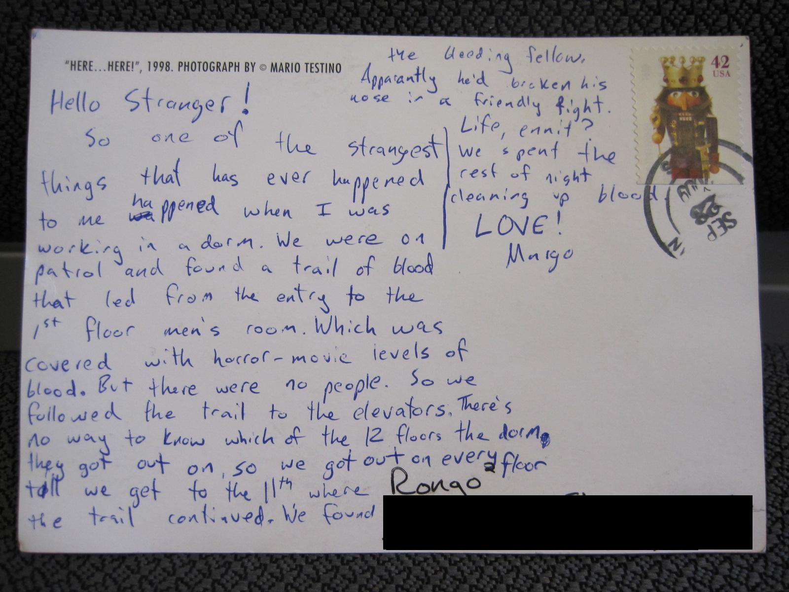 I approached them on the outdoor patio of a great little brewery/pub on Minneapolis's West Bank. I simply asked them to do me a favor. I said that I was very important to me that they send these postcards, and that they were encouraged to write whatever they wanted on the back. A story, note, poem, joke... anything. We didn't chat more than 5 minutes. They just seemed very cool. I actually held on to these cards for a while waiting for the right folks to give them to.