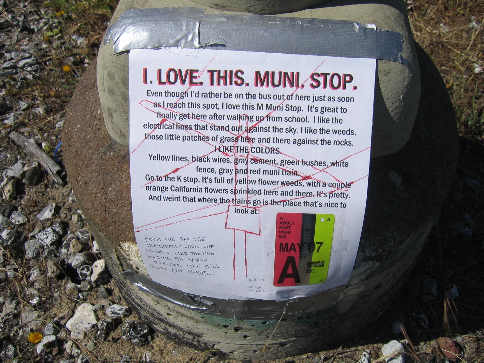 June 6th, 2007 2:52 PMLast night I printed a note and outlined the electrical wires of the bus stop on top of the words. I found a way to put one of the May 2007 bus passes to use that I found on the floor when they became outdated a few days ago.