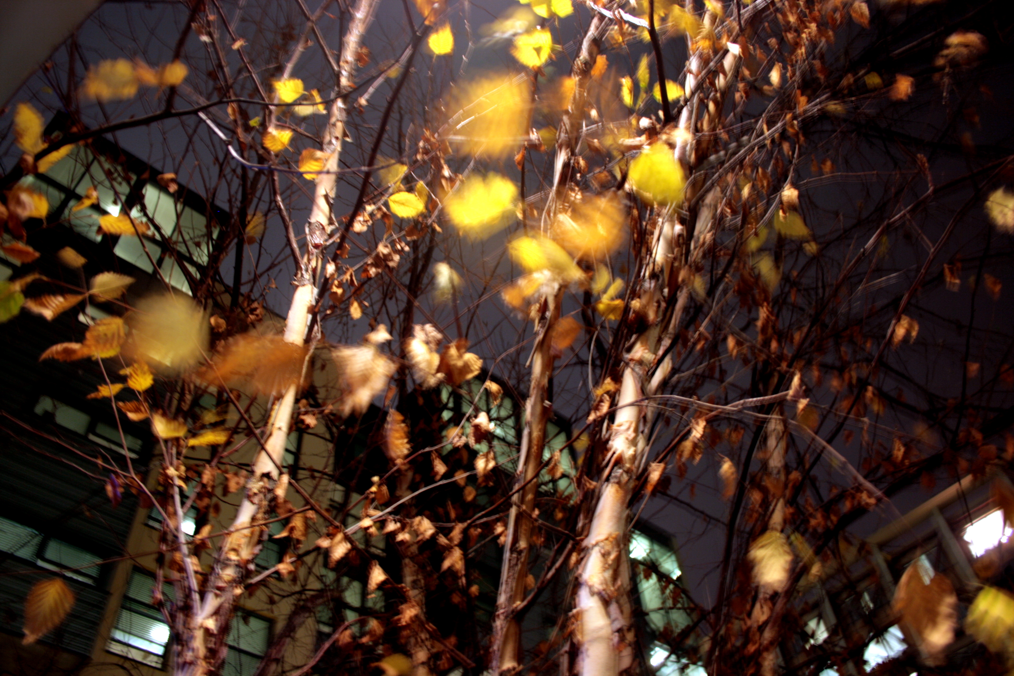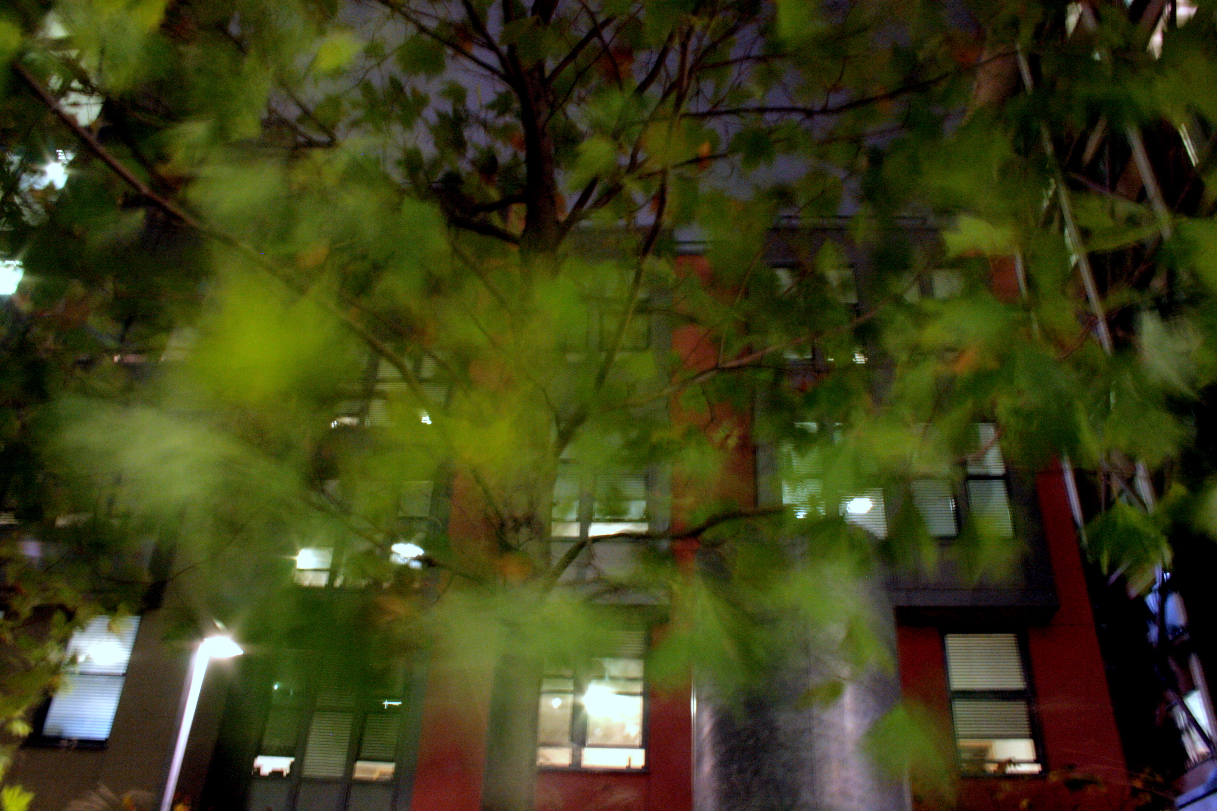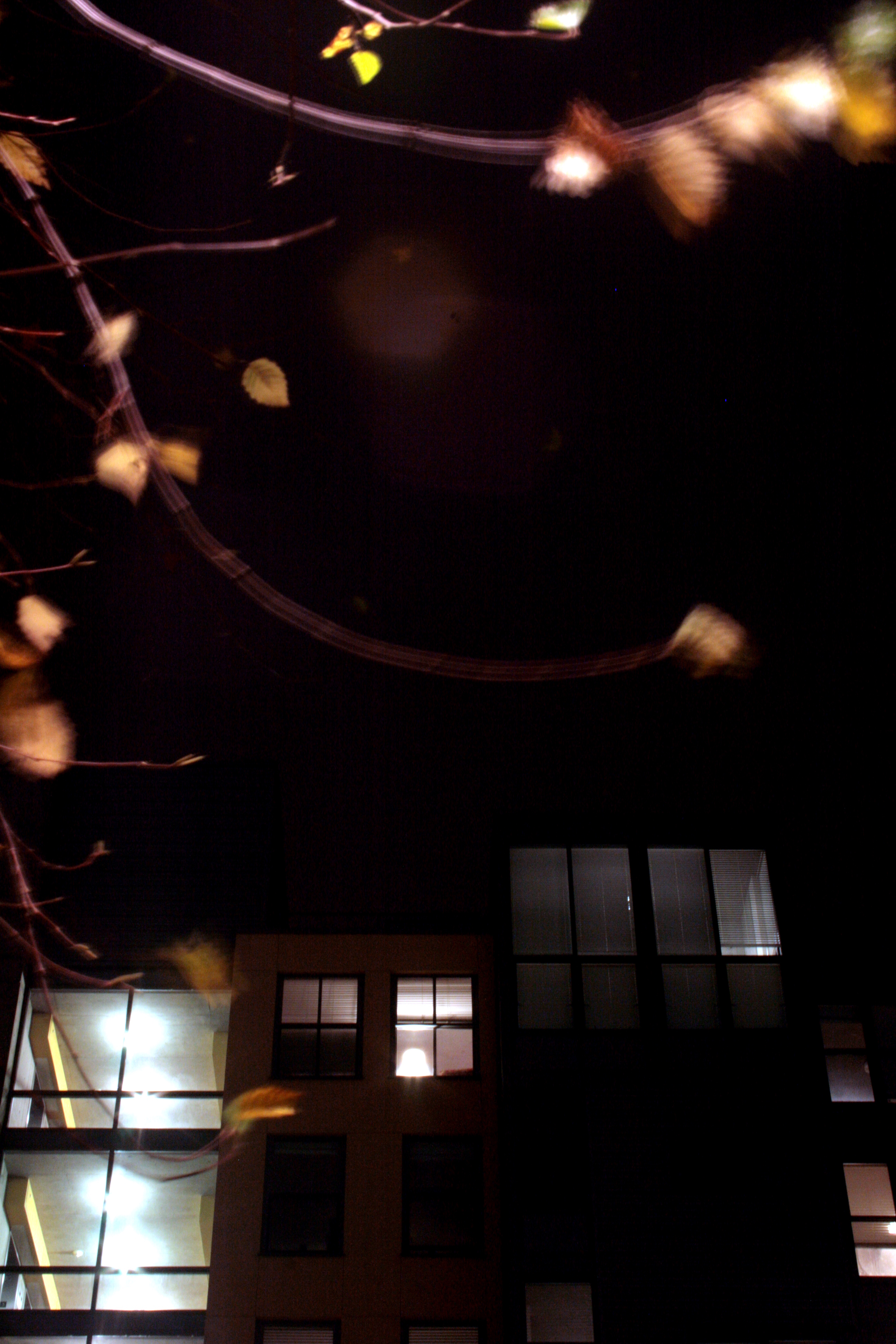 The idea was to take long exposure photographs showing tree branches moving back and forth. I picked a tree with skinny branches in the courtyard of our residential unit. I was hoping that having a high F stop and shooting the leaves moving against the solid background of the buildings would make the blur stand out more versus the stationary buildings, but that approach sort of failed and the best pictures I got were against the black sky.
