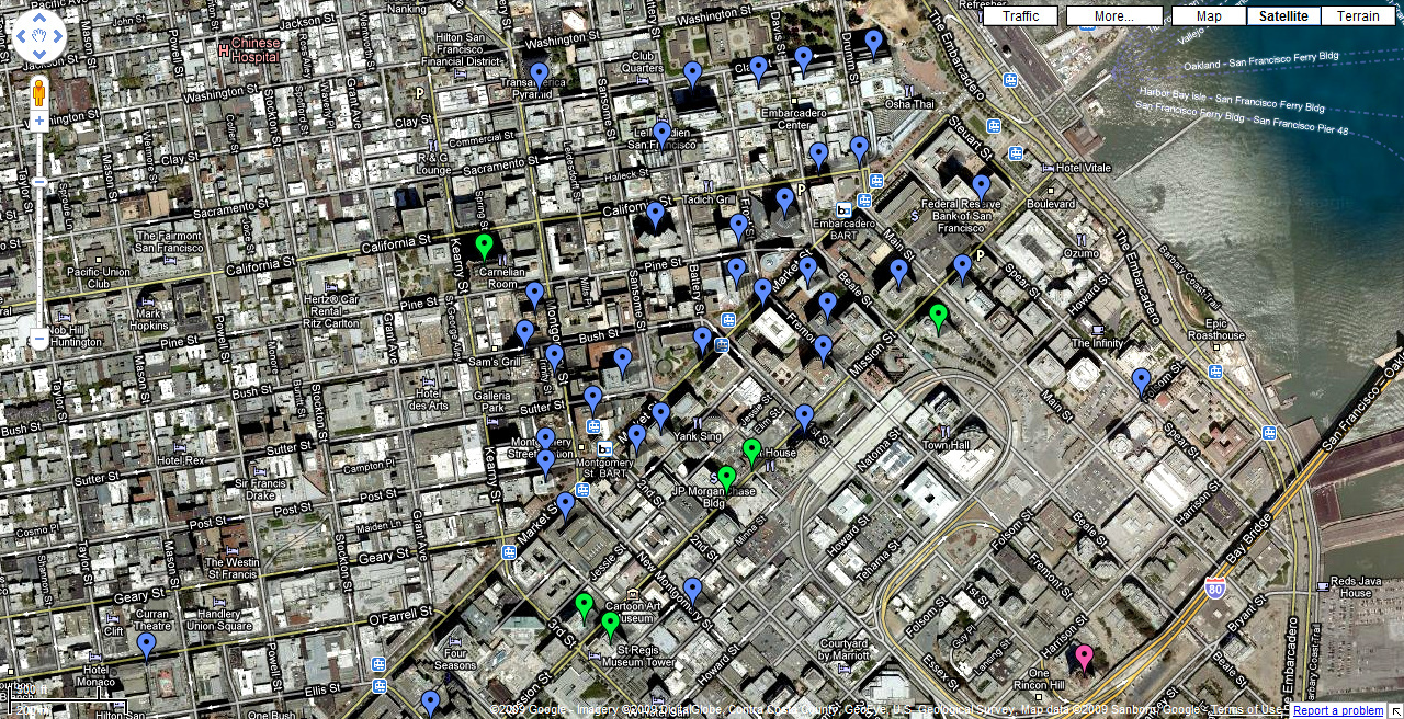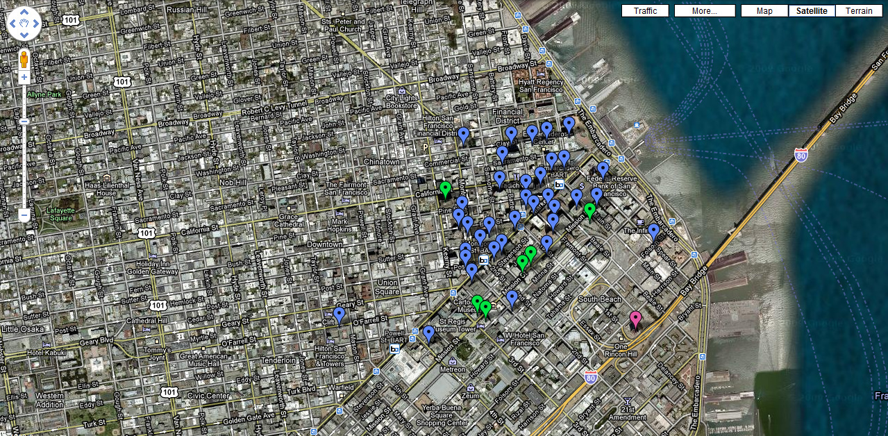 The pink one is One Rincon Hill, the green ones are buildings completed in the last decade. Most of those are along Mission street, and more are to come (like the Transbay Terminal).