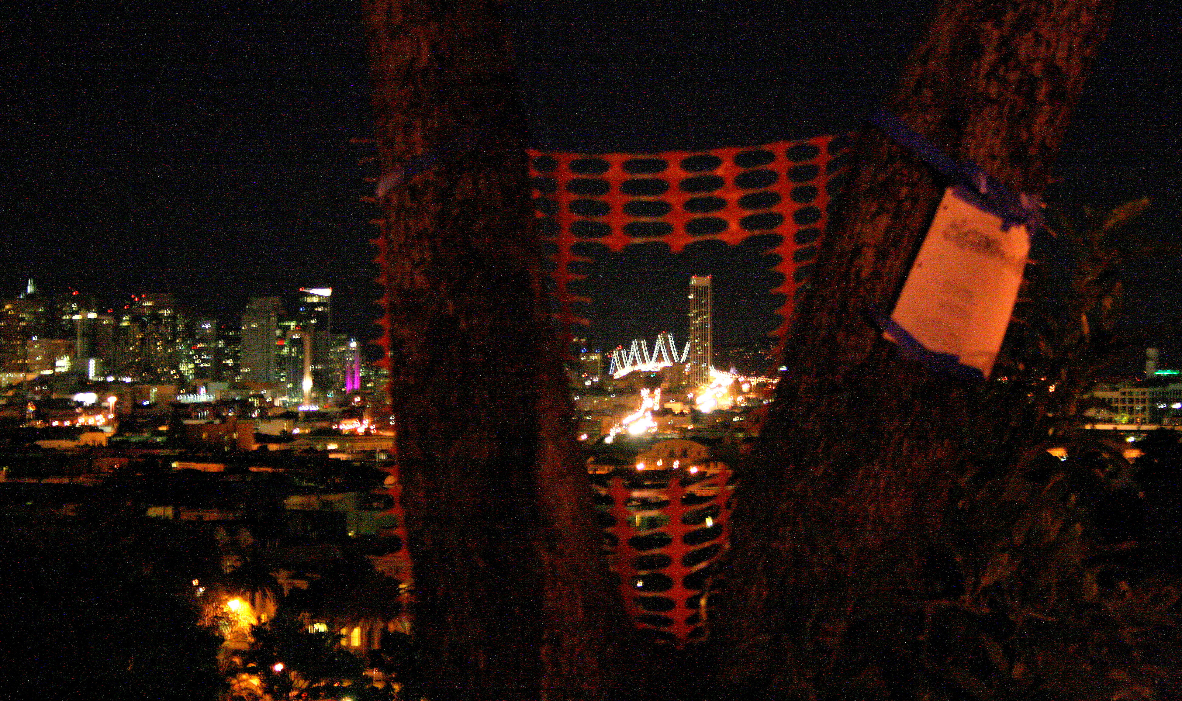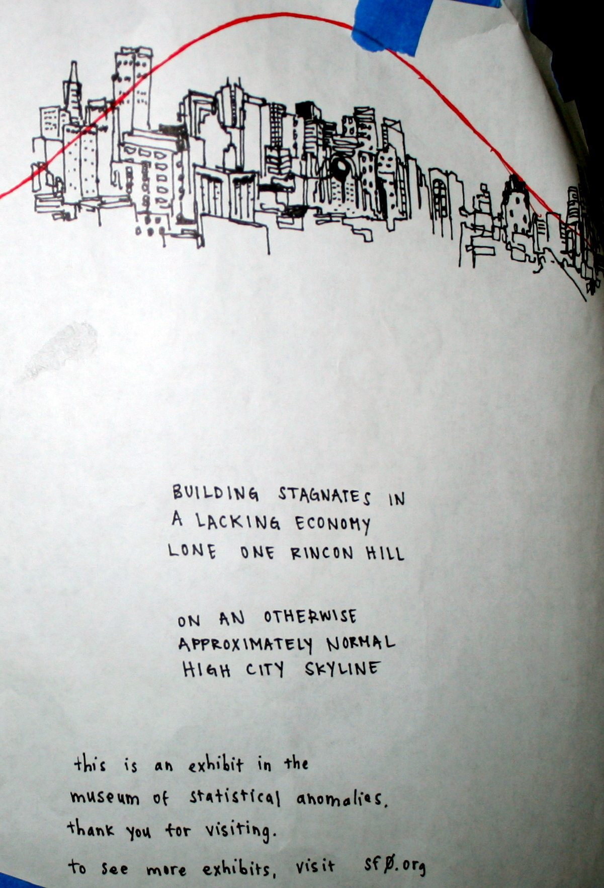 I put this statistical anomaly on display in an exhibit at the top of the hill of Dolores Park. Orange construction fencing hangs between two trees, framing the view of One Rincon Hill. A paper plaque describes the irregularity of the skyscraper and mentions that other exhibits in the museum of statistical anomalies may be found at this here website. By the way, fixing things to trees is difficult, especially at one in the morning when the wind is blowing madly and nothing sticks to tree trunks. Only one person asked me what I was doing and then said he called One Rincon Hill "the space heater building" because it looks like a giant space heater.