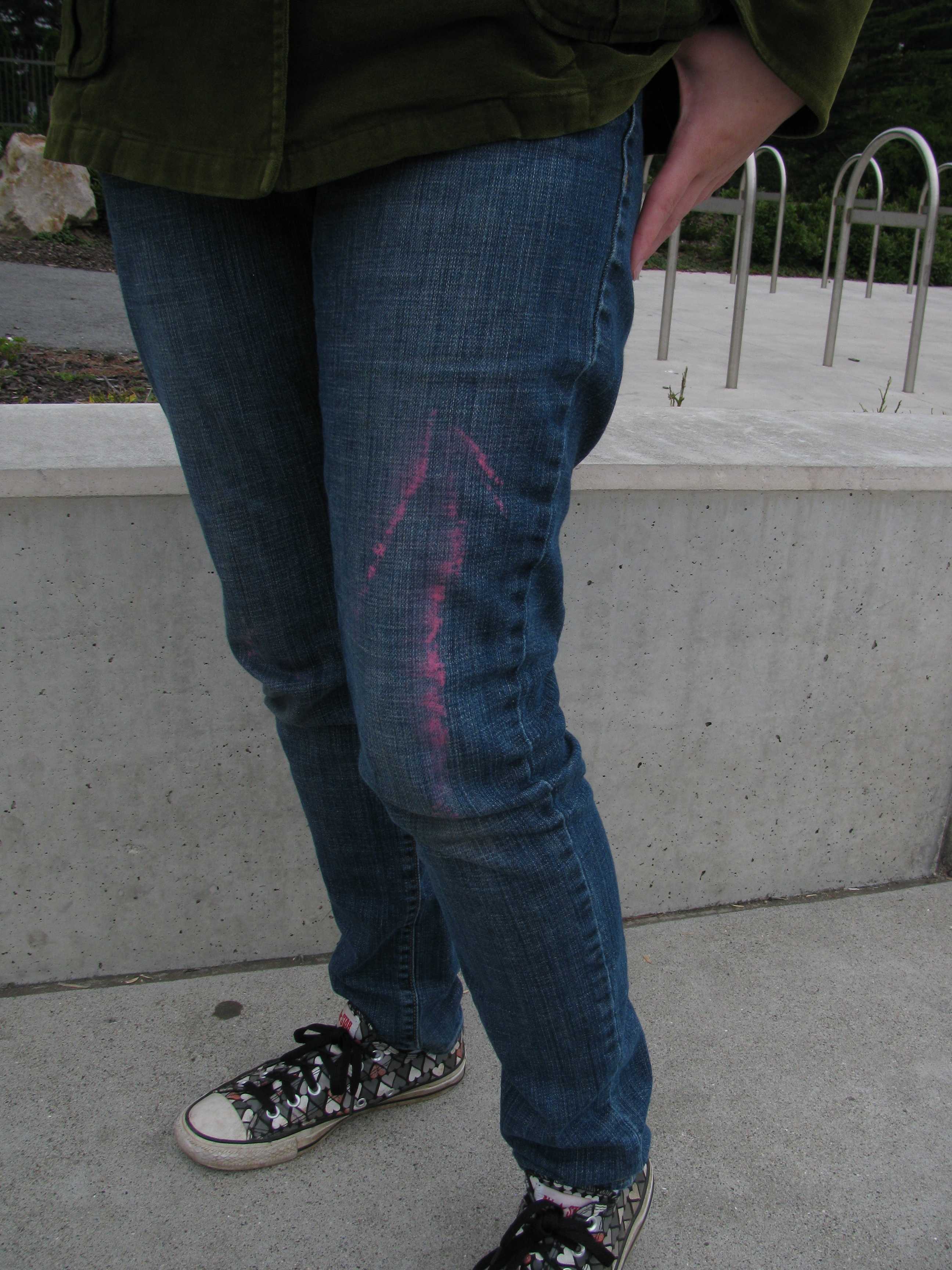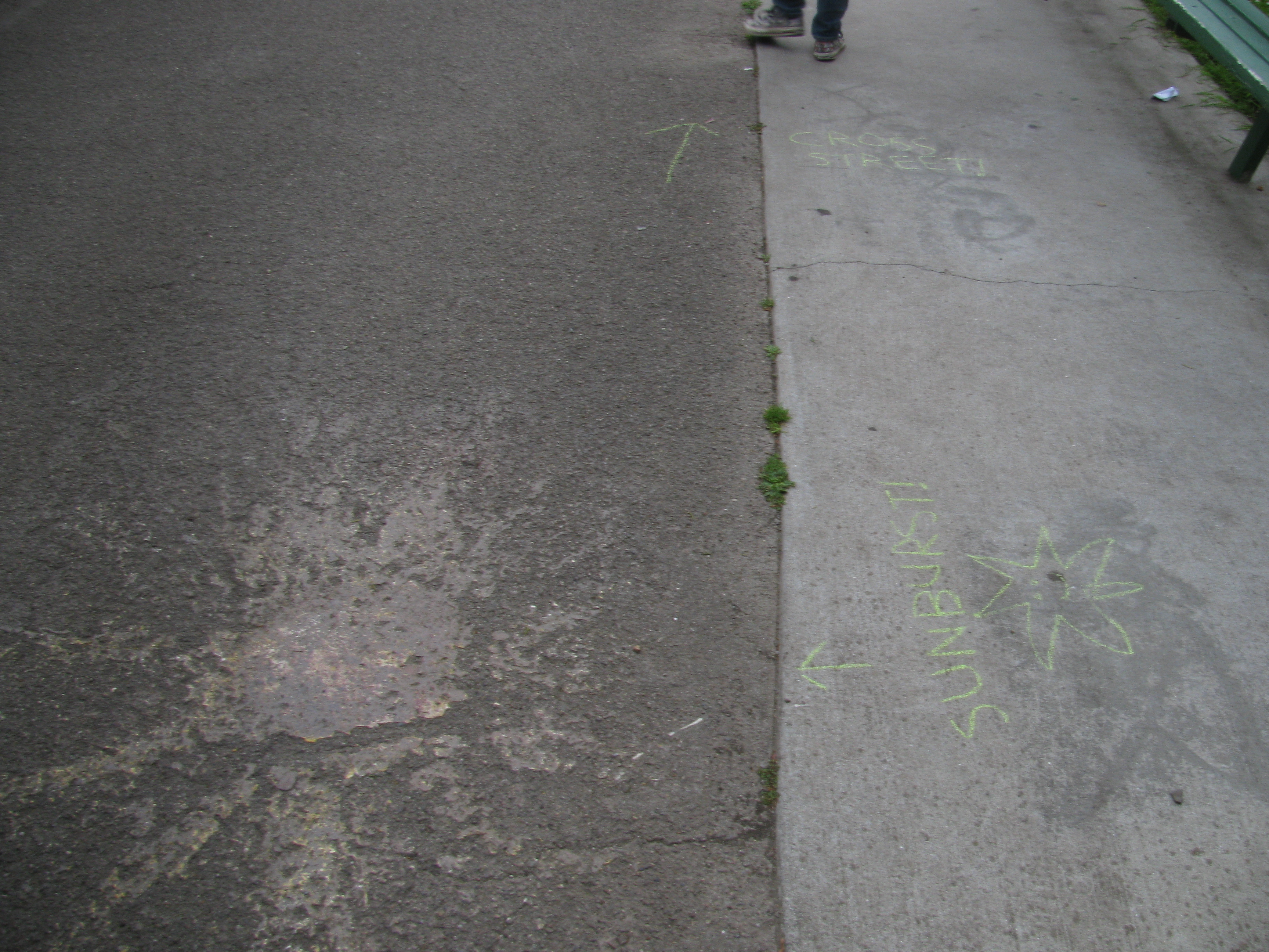 In the course of our Dérive, Juliette's clothes had numerous encounters with chalk. Completely by accident, one of them created an arrow on her! I (Supine) decided not to secure her to the ground and use her as part of the route, as that sort of thing is generally frowned on in polite society.