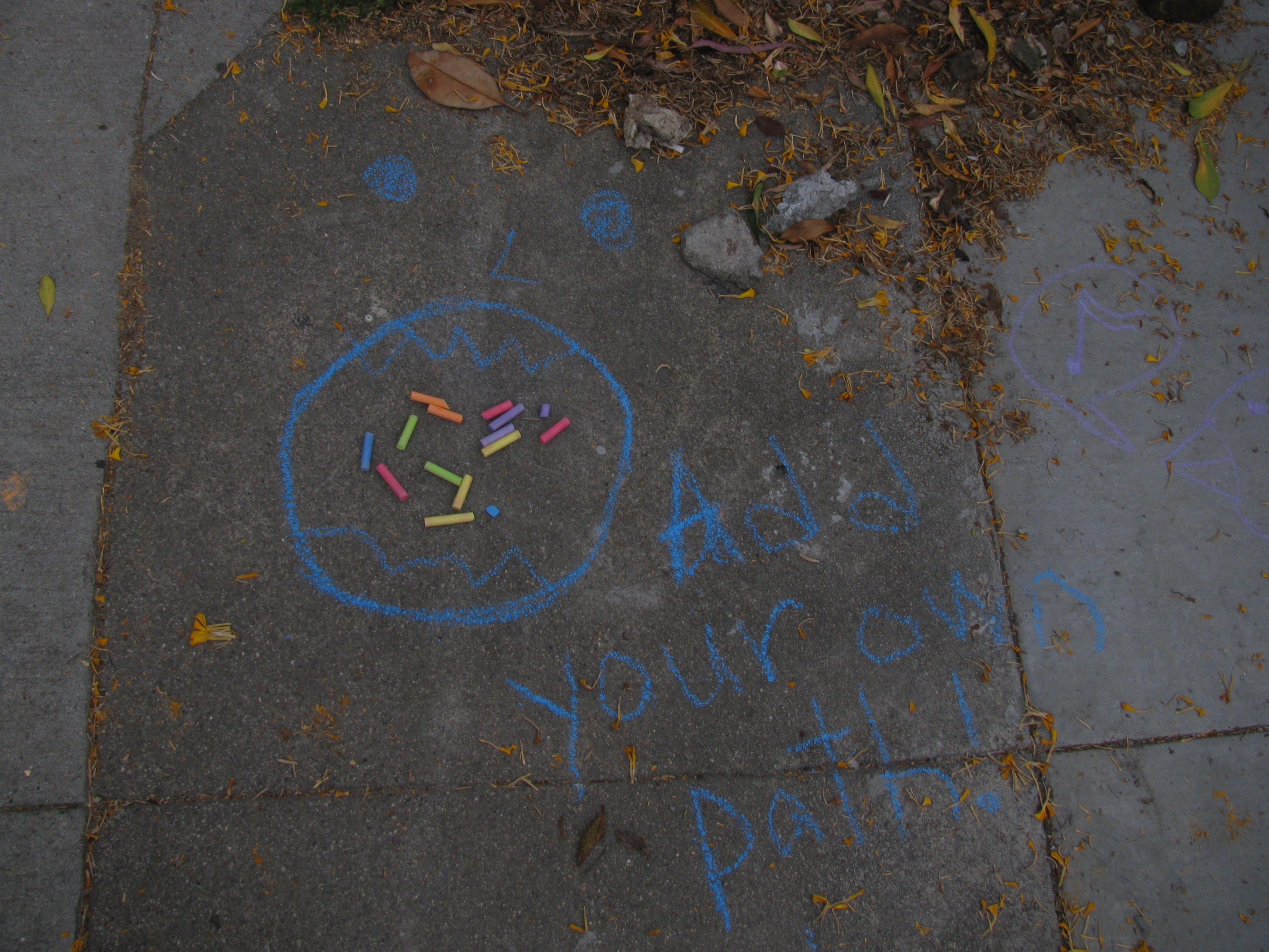 This praxis will grow later, but we wanted to post it ASAP so it can be continued before the chalk gets taken, or the arrows get walked/rained off. You can see the pictures below for a glimpse at the trail. (they are being uploaded as I type) Also, we'll add a google map of the route later on. If you add another leg to the trail, message one of us and we'll add you to the praxis. The bigger the dérive, the better!