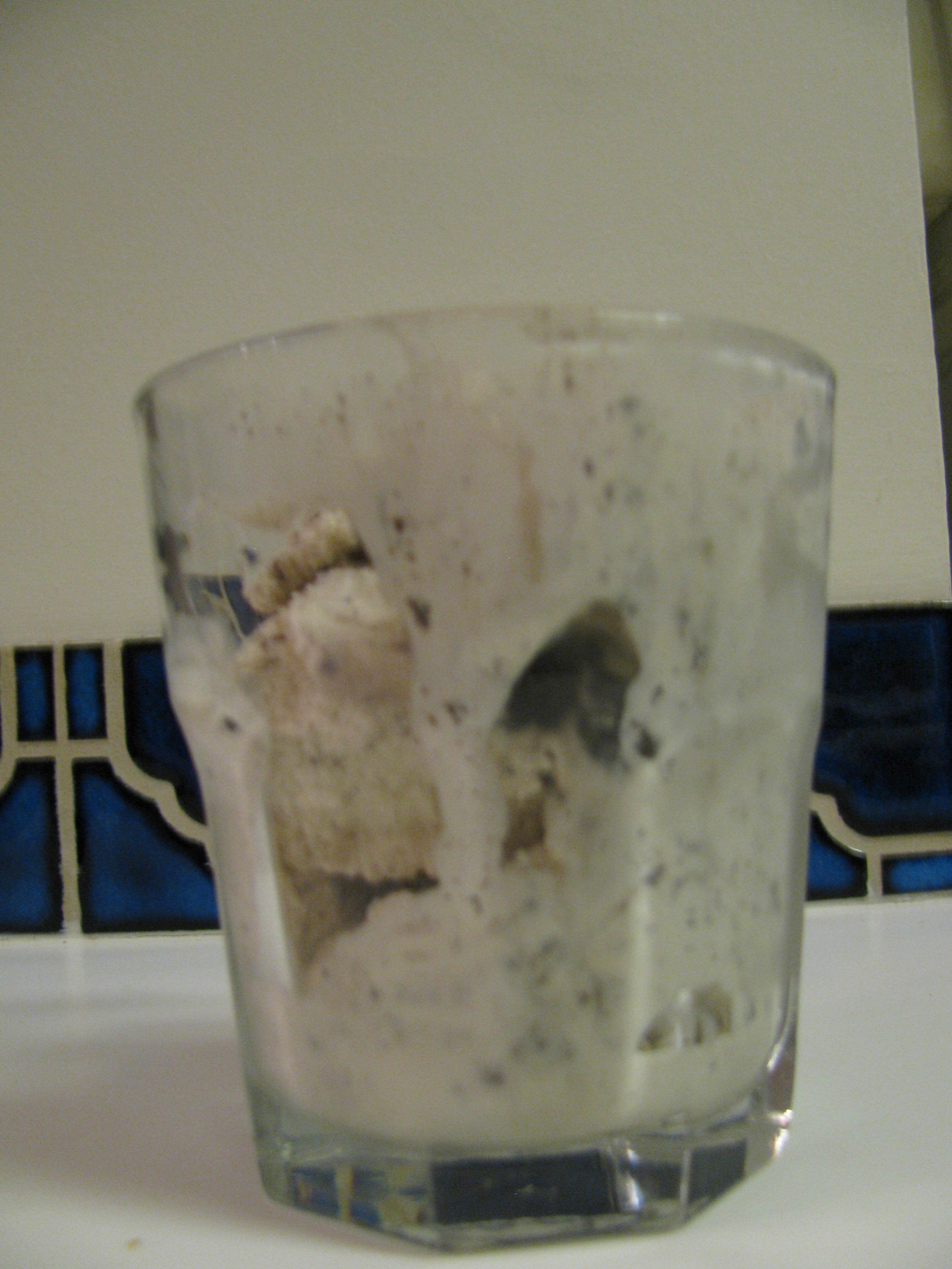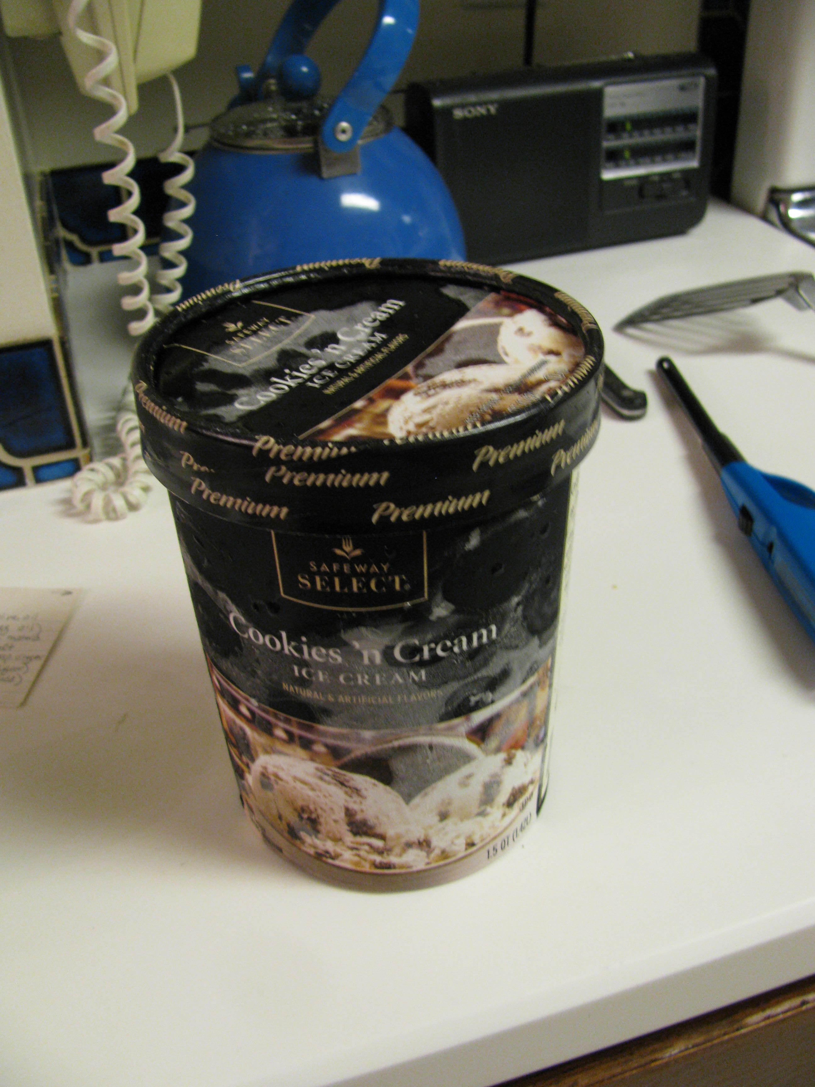 Juliette: Alright, here's why I don't like cookies-and-cream ice cream: not only are the little oreo-like bits repulsive-tasting (Oreos are just gross), they make delicious, creamy, rich ice cream *gritty*. It's like adding dirt, or maybe sand. Would you like the texture of sand mixed in with your smooth, buttery ice cream? When you eat cookies-and-cream ice cream, that's what it feels like to me. I'm a very texture-oriented, sensual person, so this flavor of ice cream is just really, really icky. But, y'know, I'd like to like it, or at least not hate it so much? That would be cool. So I'm going to try really hard to ignore my previous experience and just eat some cookies-and-cream ice cream.
