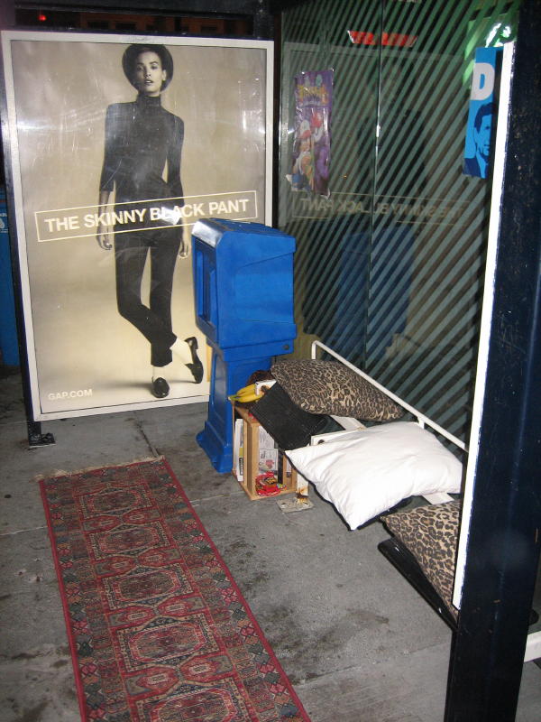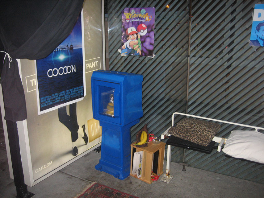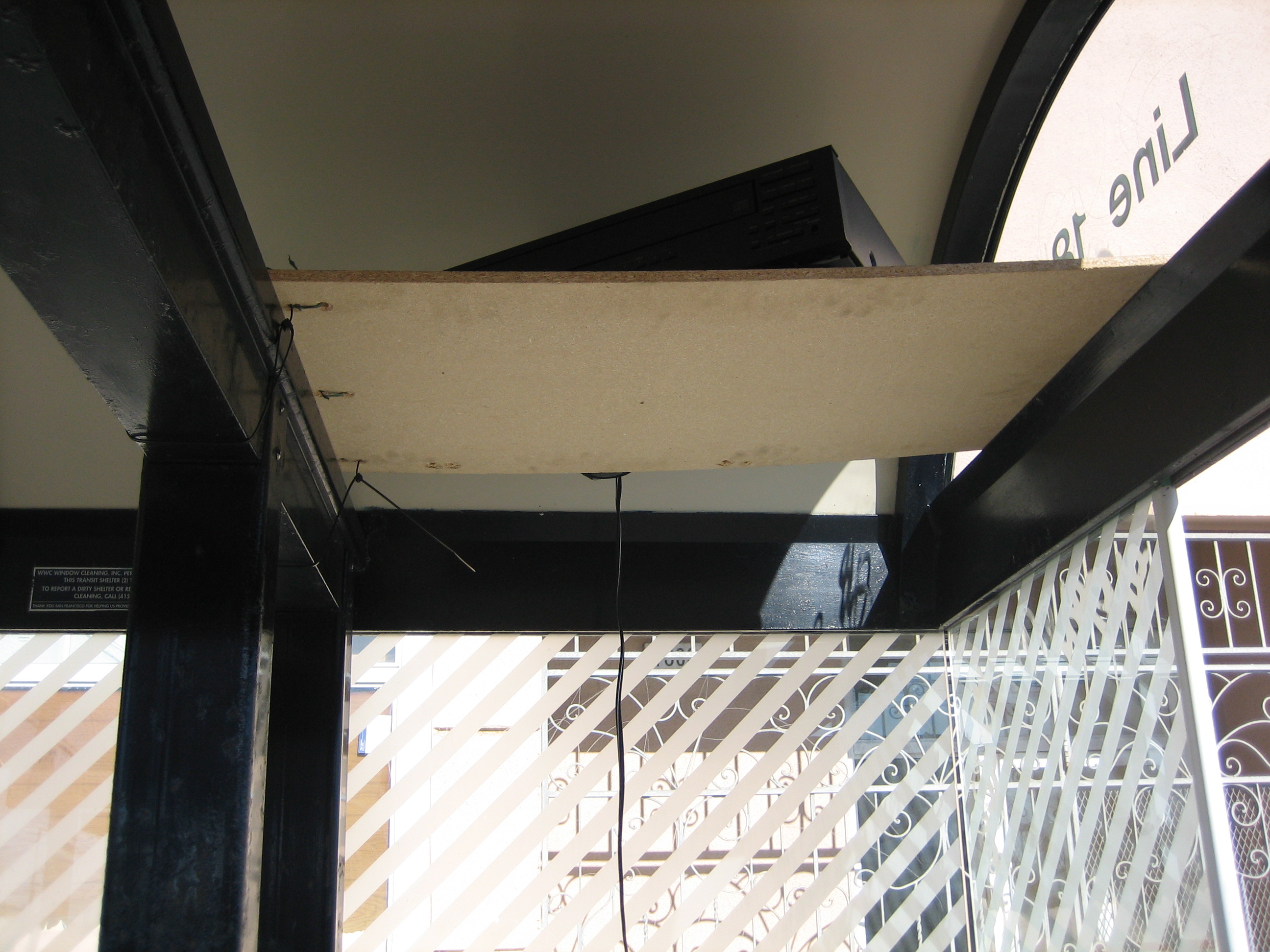 I began the long scavenger hunt for materials. I "found" a nice magazine receptacle that someone had ever so carelessly "left" on the sidewalk for me. I cleaned it up and painted over most of the markings. I got a huge sheet and some rope that we used to make curtains, a pokemon poster, random crap. I finally got a chance to use some of the enormous collection of random electronics that I have been hoarding for years. After that, I finished my muni shelter hunt. Again some weird guy poking around the top of a MUNI shelter in the early AM hours.