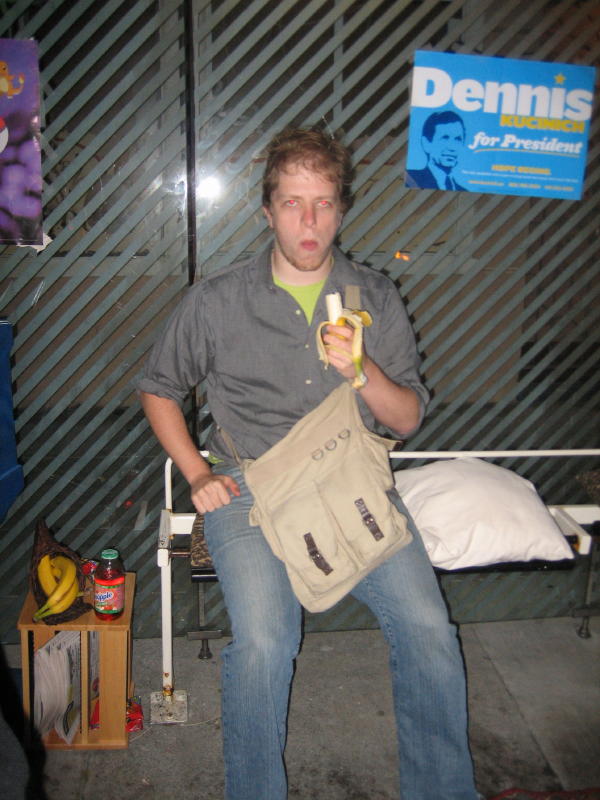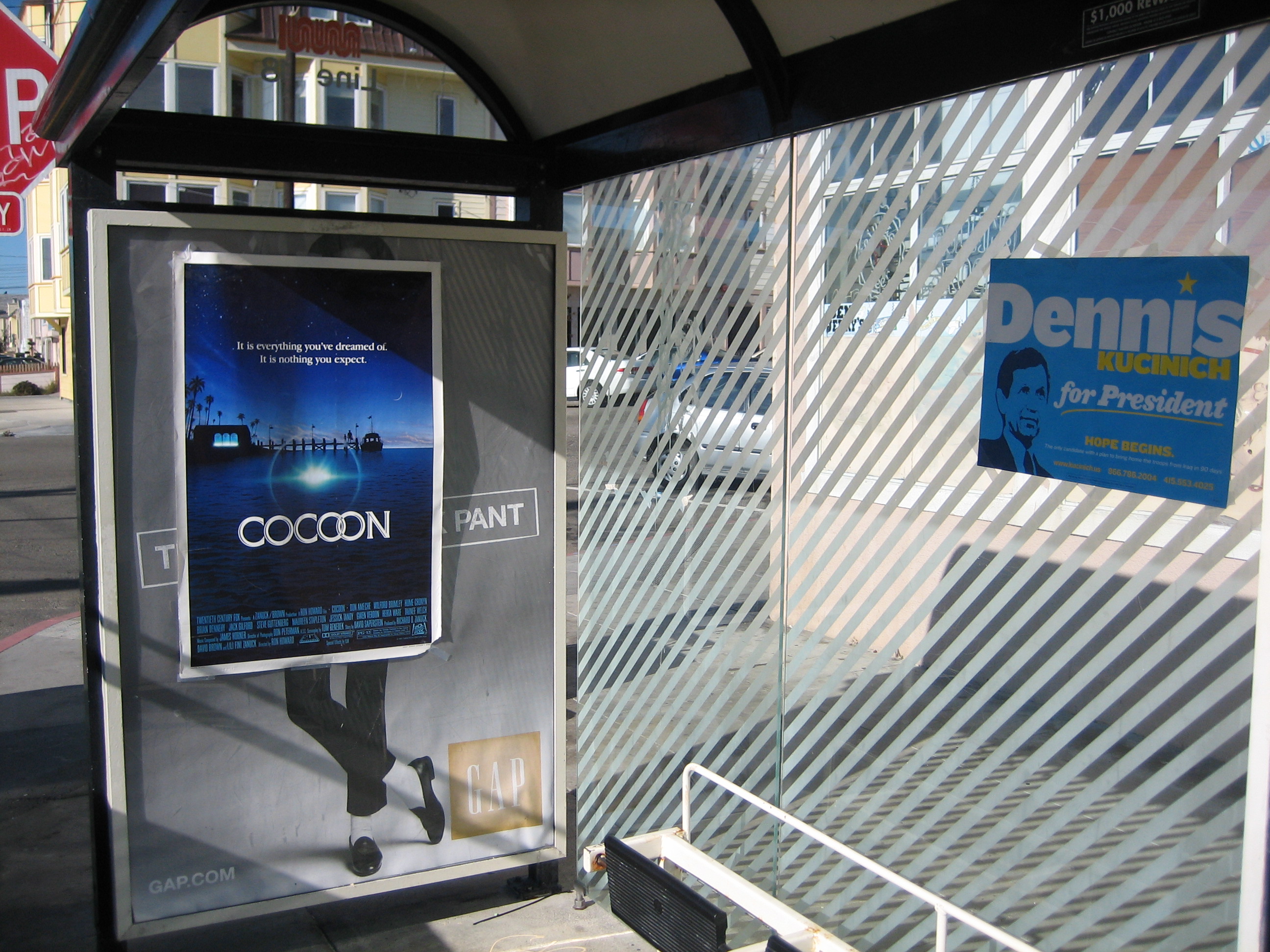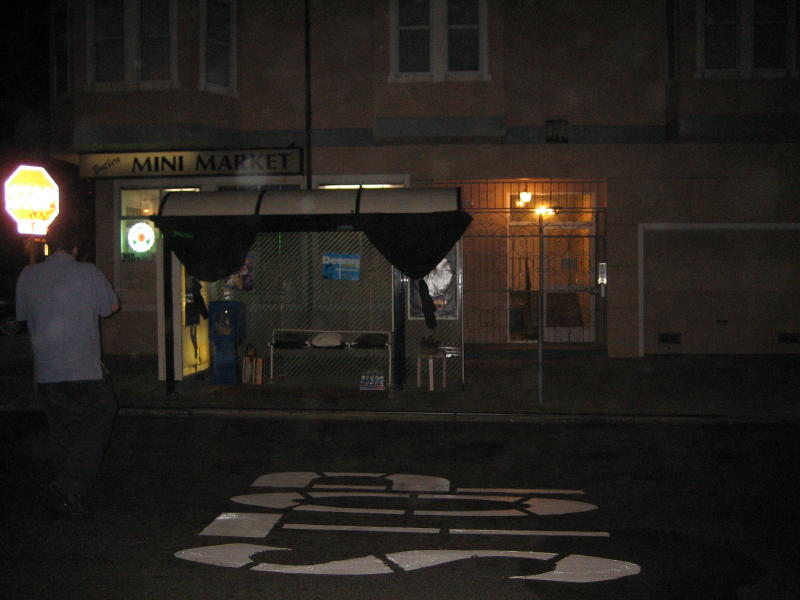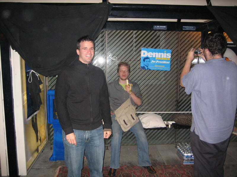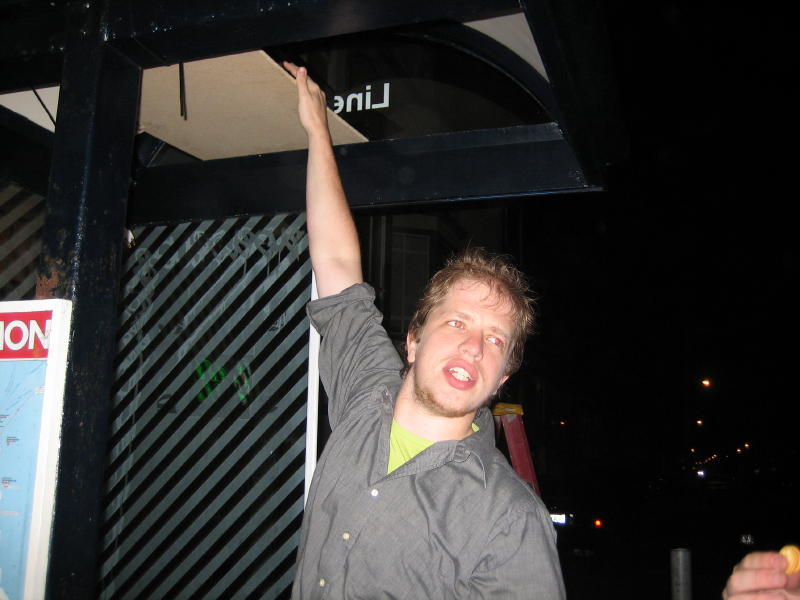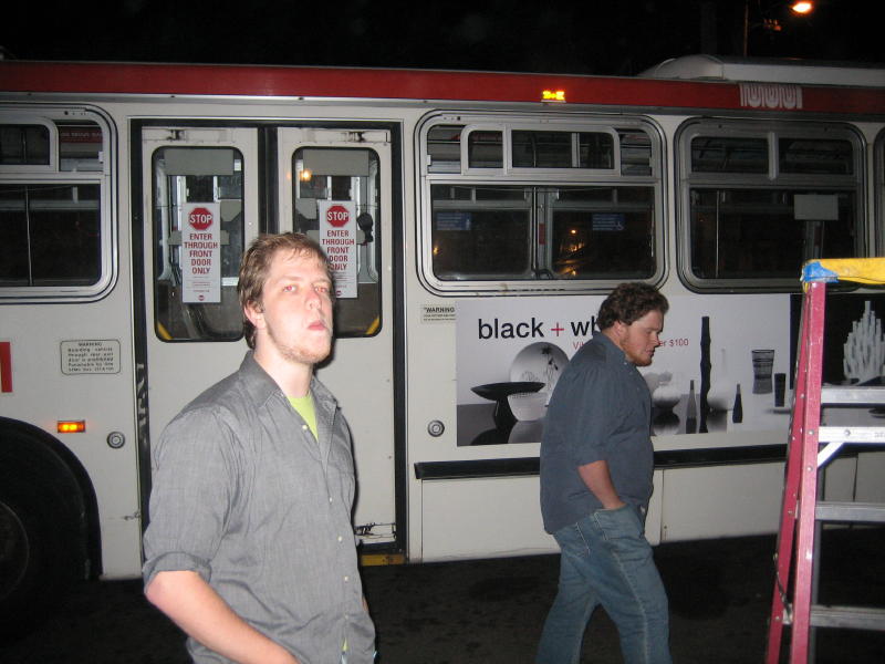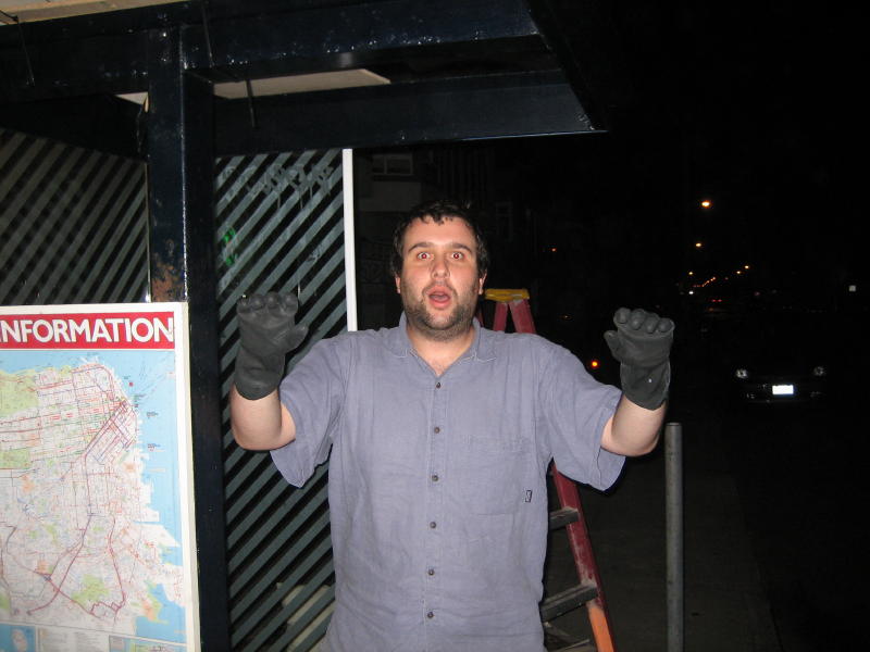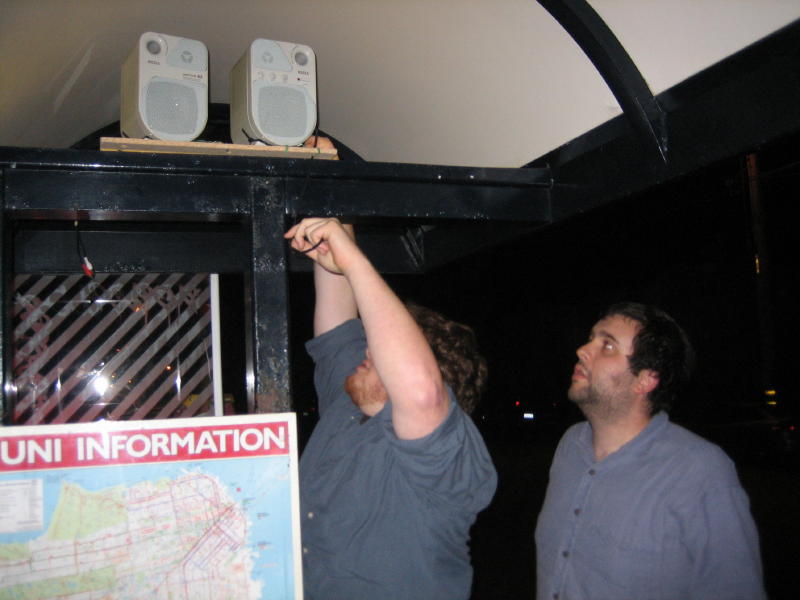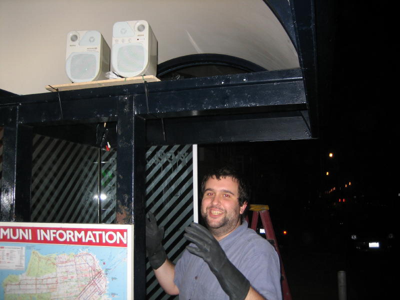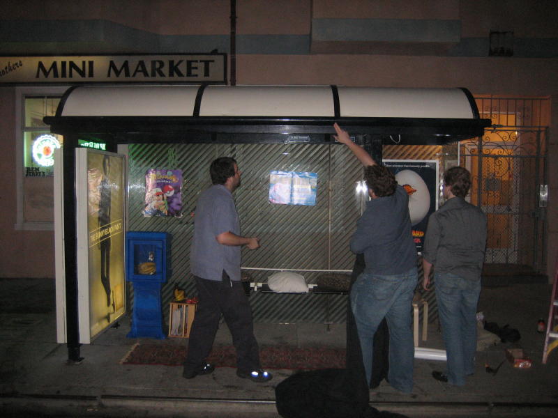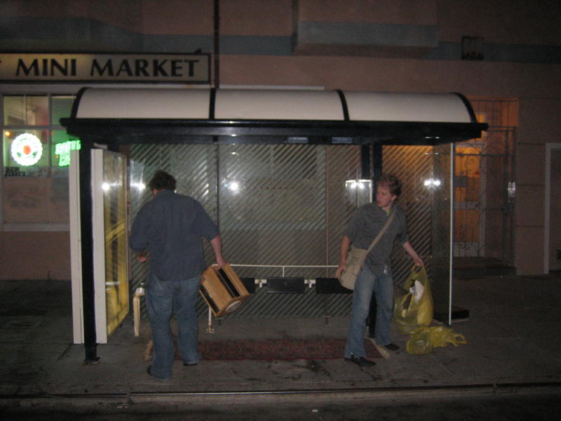 Orion:It was cold and the citizens of San Francisco had no comfortable place to rest while waiting for a bus…or waiting through the night. A few hours of planning (and a trip to Goodwill) later and all that was about to change. Though I’m still fond of Britt’s joking idea to turn a bus shelter into a working foundry (complete with anvil and a bellows to keep the fire warm), we were still able to heat things up with Lowteck’s ingenious music rigging and some warm “dorm inspired” decorations like throw rugs, flowers, posters, and a Horn of Plenty full of fruits and crackers. There’s even a strobe light. We were a bit wary of the police car that kept looping around…but I figured that, given a few minutes in our cozy shelter, even an officer of the law would turn down the $1000 fine offered to turn us in. I was quite adamant that all advertising needed to be covered, as a responsible BartPA member, but I’m afraid the only way to get this sort of kick-ass public seating installed city-wide would be through some sort of corporate sponsorship. Either that, or we’d have to spend many a cold night ourselves doing the deed…which might not be a bad idea.