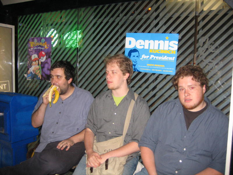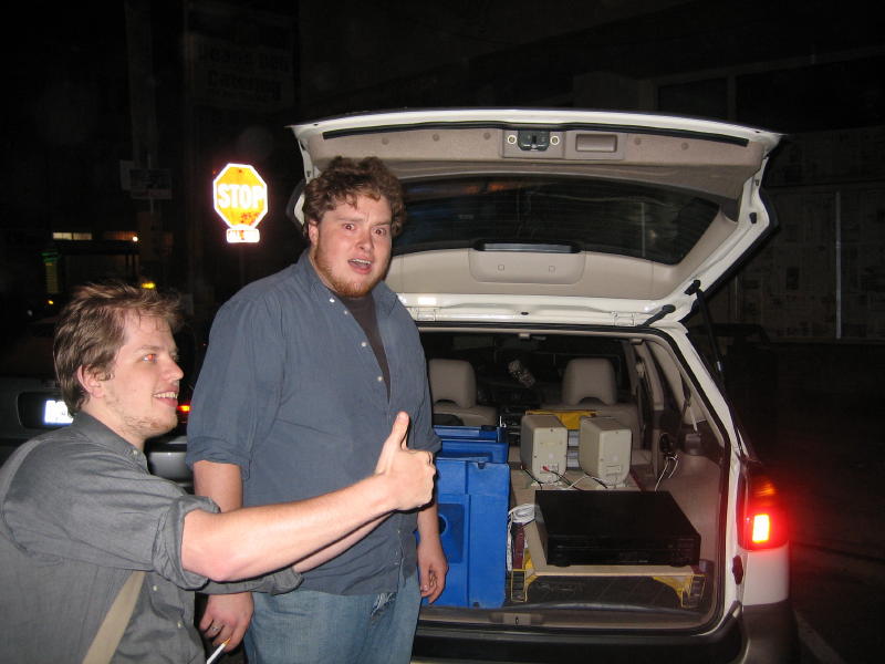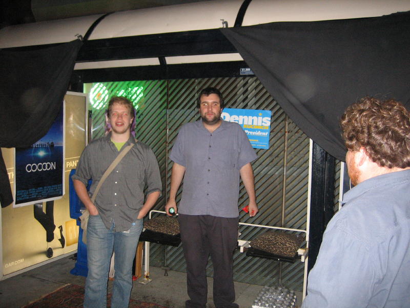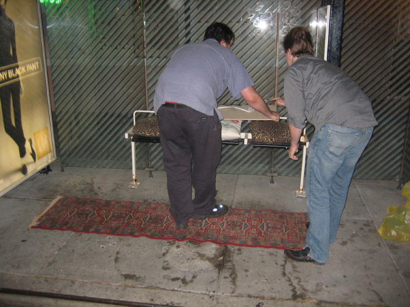 Cameron: Unbelievable. Orion, Britt, and I thought we were such rockstars for bringing two endtables, a rug, some pillows and assorted knickknackery. Lowteck brought a 5 disc cd player, speakers and a strobe light. Mounted to a board pefectly measure to fit in the eaves of a bus stop.