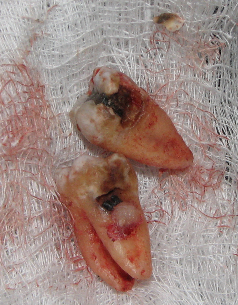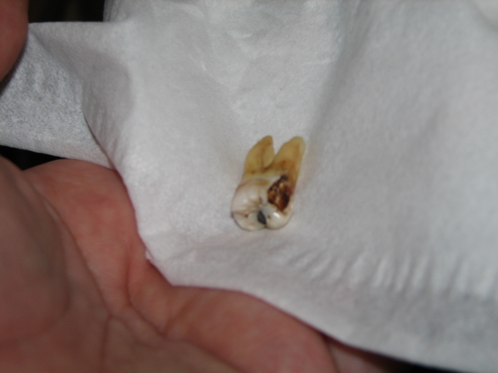 I had an abscess on the other side of my mouth and that rotted decayed tooth also had to be removed. Photos uploaded for your pleasure at my pain. Or your disgust, anyway.