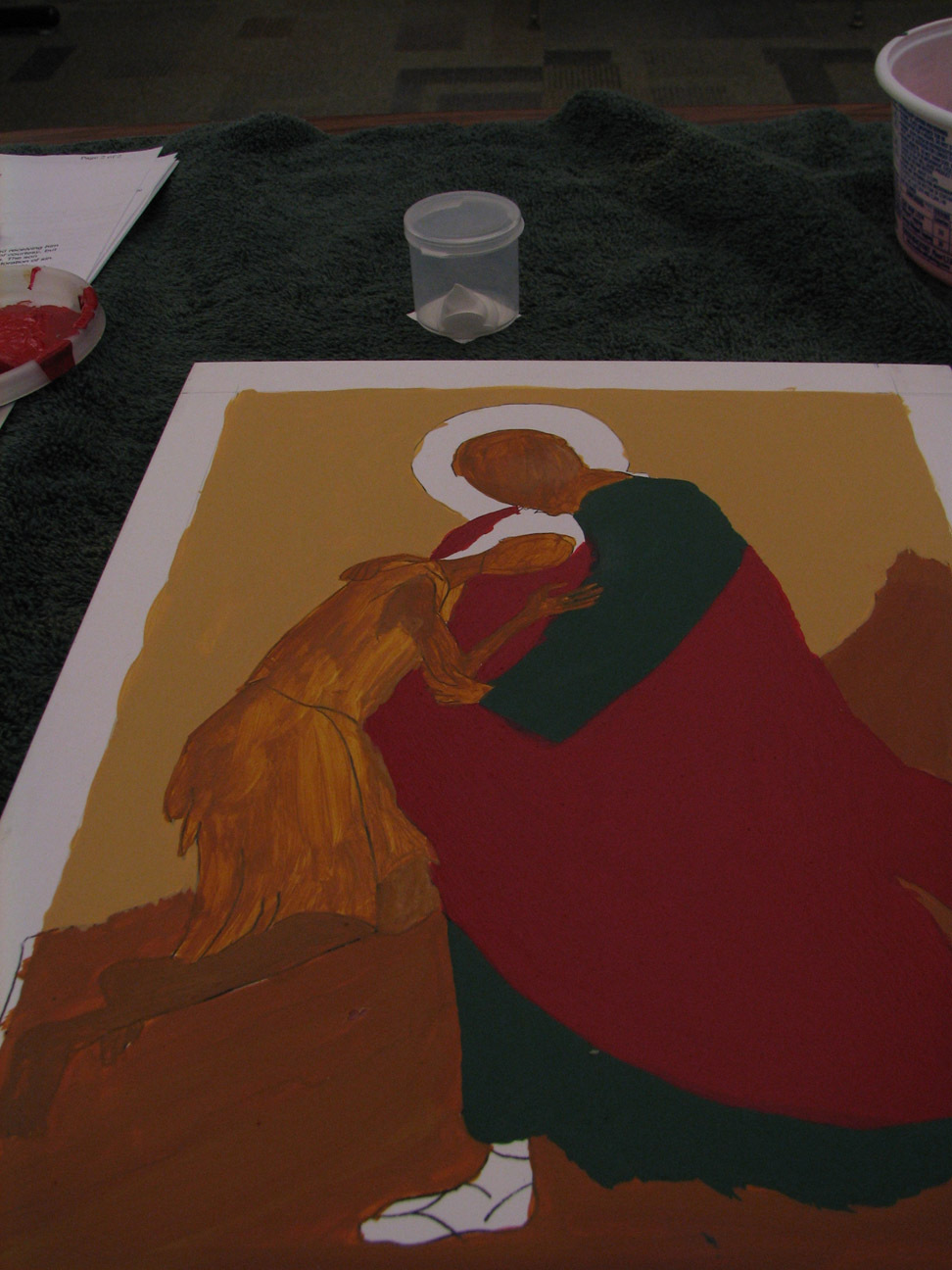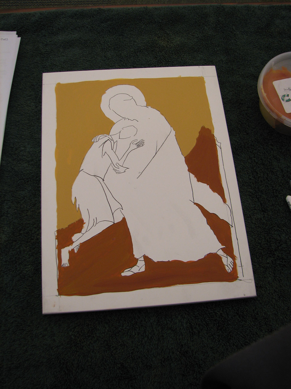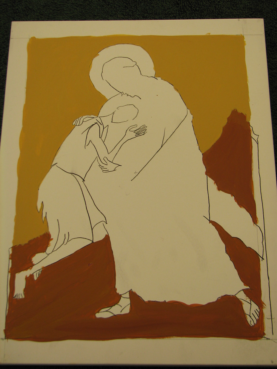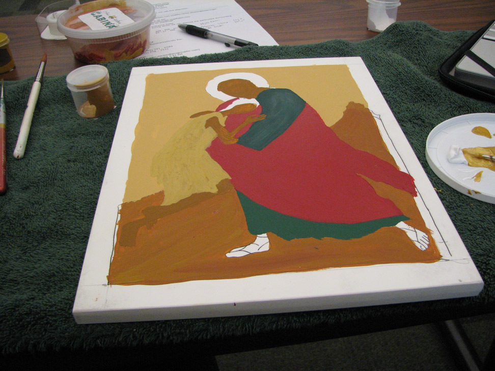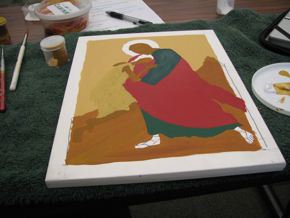 the skin is in raw sienna. we were told that traditionally white is built up from other colors but we could put the son's robe in white, just pure white. it happened I had about three extra hours of time on my hands so instead I started him in raw sienna, and added white and white and more white until the top layer of the robe was white. Often they build up from dark blue, though she said a person could build up from any color. I wanted to dress the flesh so to speak, so I started with the raw sienna.