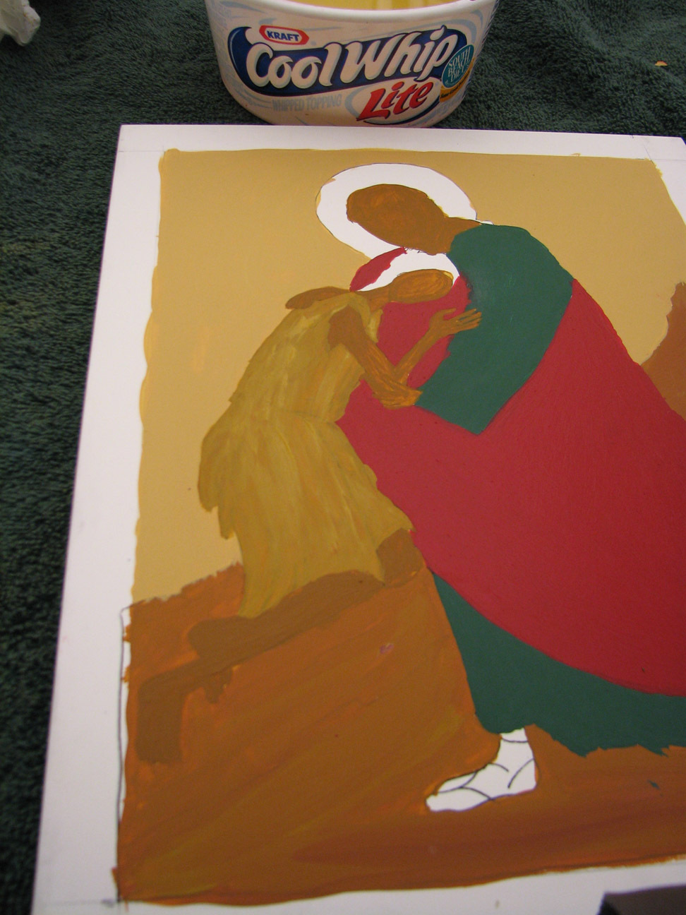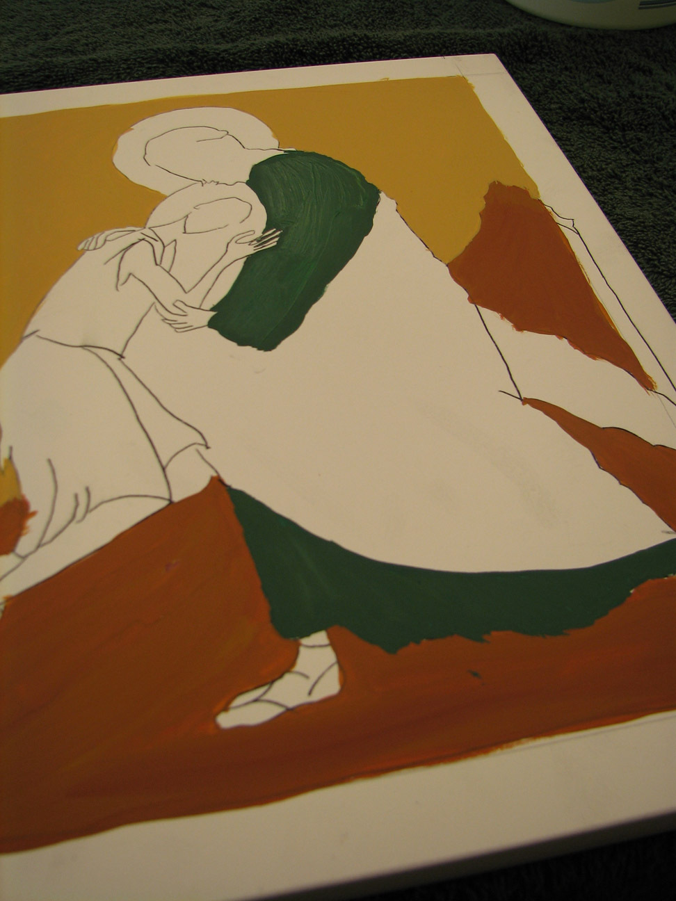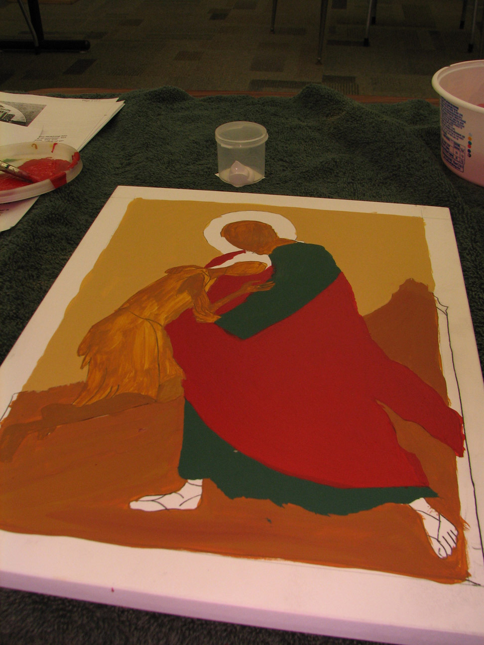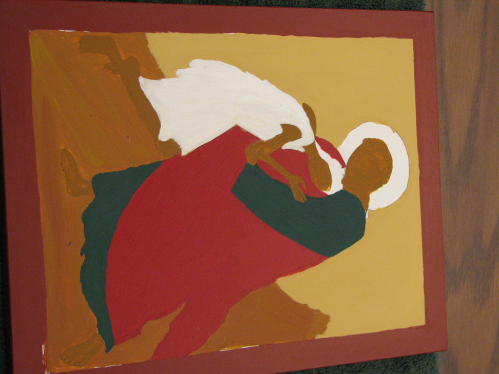 the skin is in raw sienna. we were told that traditionally white is built up from other colors but we could put the son's robe in white, just pure white. it happened I had about three extra hours of time on my hands so instead I started him in raw sienna, and added white and white and more white until the top layer of the robe was white. Often they build up from dark blue, though she said a person could build up from any color. I wanted to dress the flesh so to speak, so I started with the raw sienna.