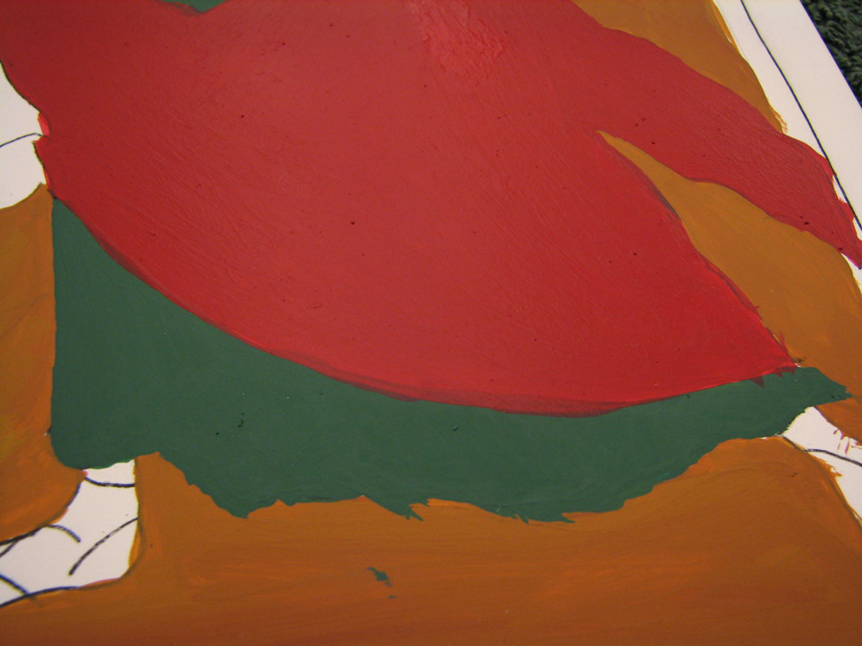 about to add the shading to the robes. here I should have stopped fiddling with the green and the red. I also should have had a lighter touch with later dark layers. This insight is only possible in retrospect.