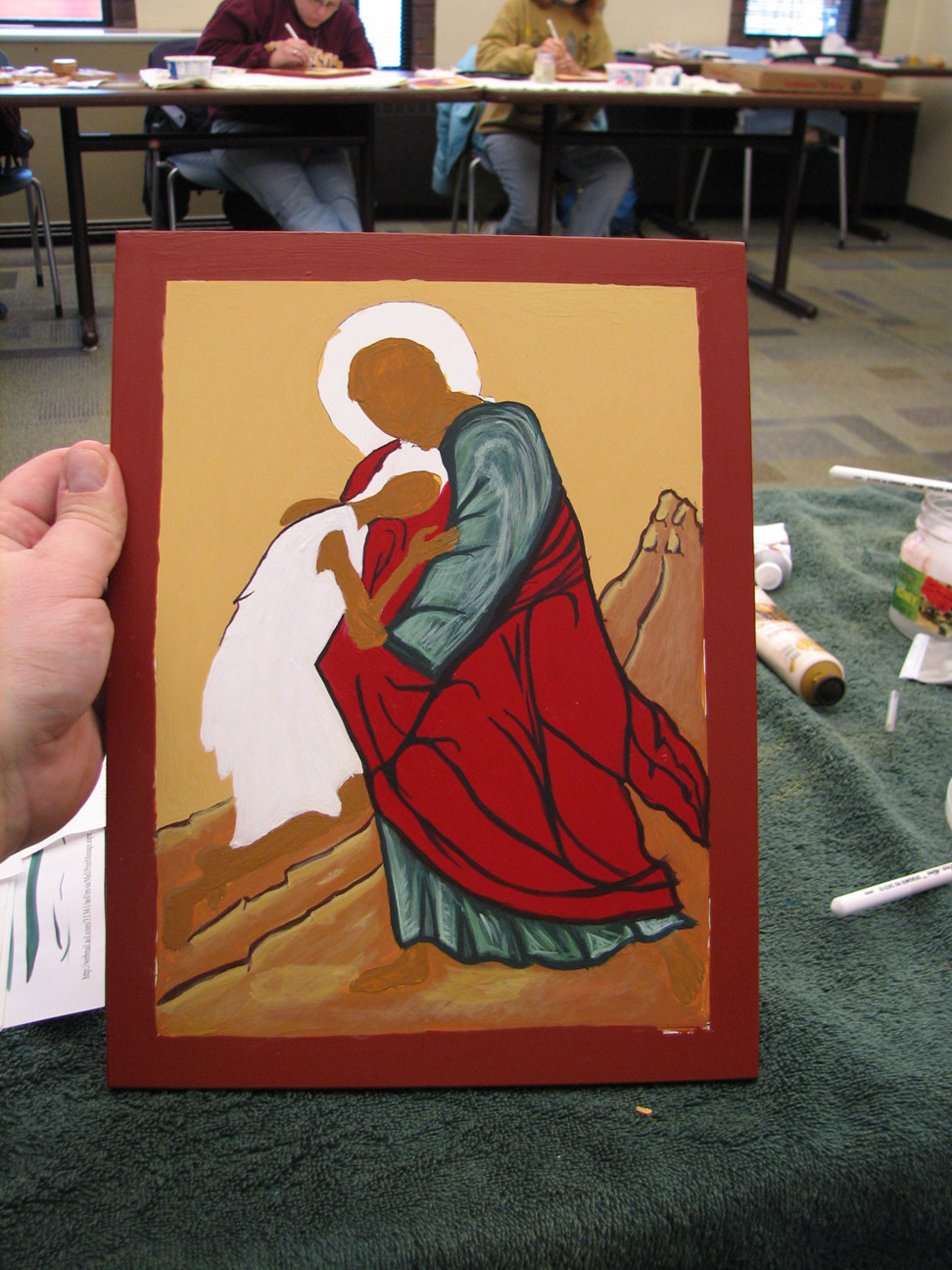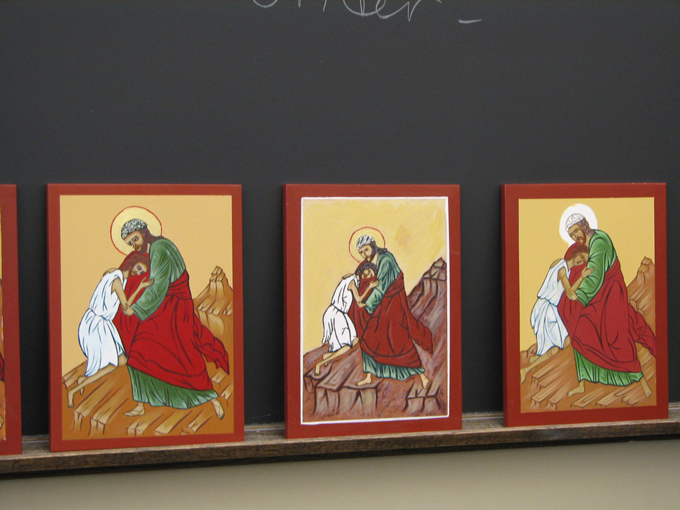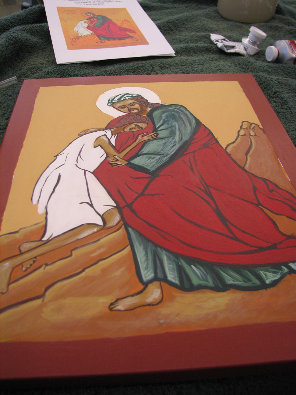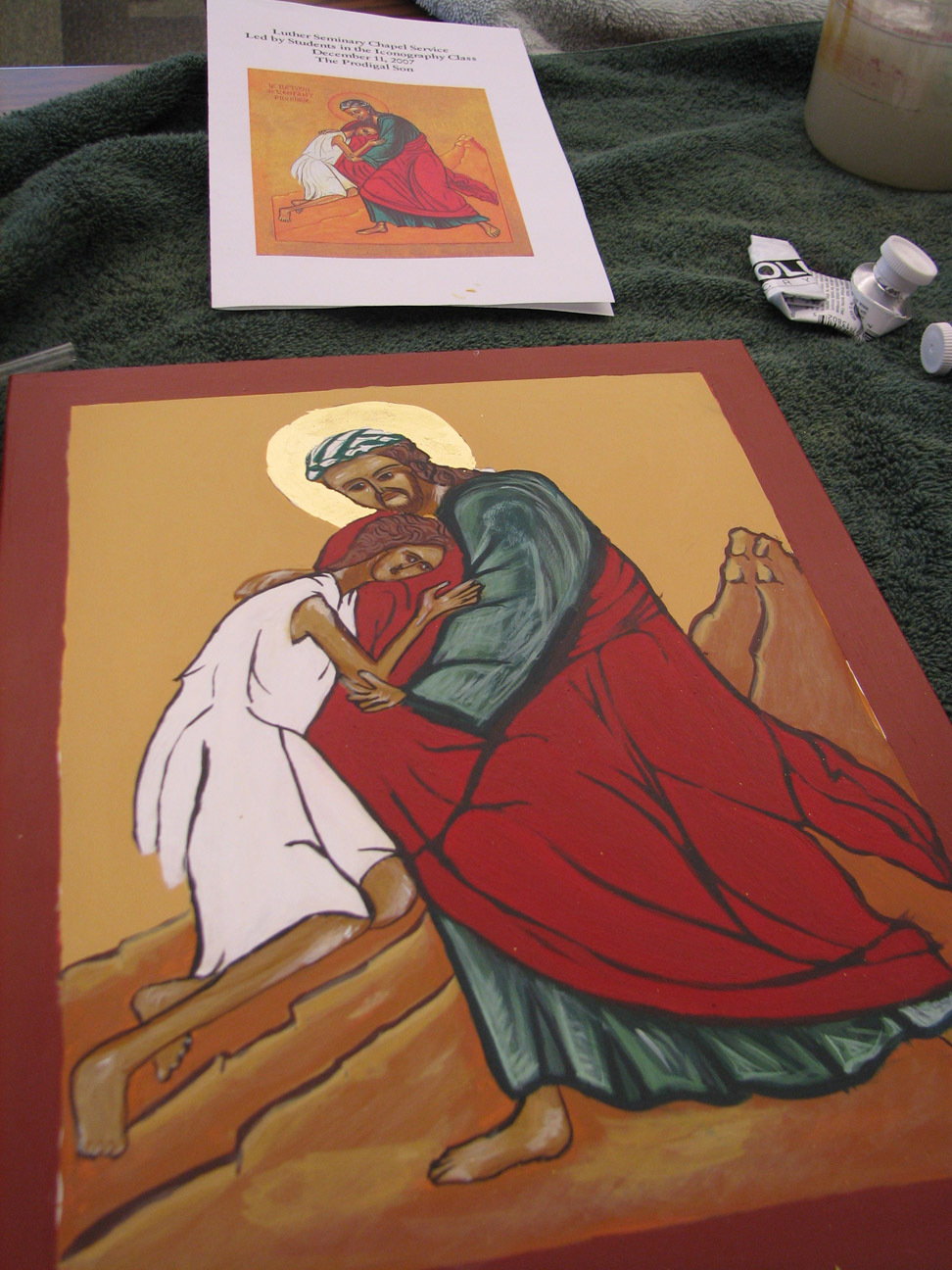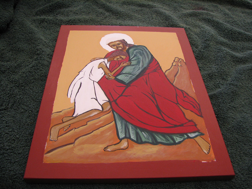 Iconography that resembled any kind of ancient forms and rigid traditions was the furthest thing from my mind six weeks ago. In the course of painting, or "writing" an icon of the parable of the prodigal son, I formed a profound and unexpected intimate relationship with an inanimate object. I assumed we'd be learning about the process of iconography from a theological and historical perspective, and then be required to complete a project that resulted in an icon-like object, maybe write a paper. I was prepared to output something with my well-practiced skills in the trinity of technique, appearance, and product. How naive! It's also naive to forget that, even in my cynical moments, behind that trinity stands the original, most holy. In any case, time and mystery and spirit won out, using technique, appearance, and product in the service of higher and sometimes confounding purposes which I grasp now dimly.