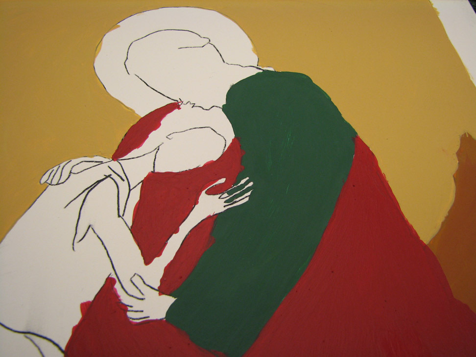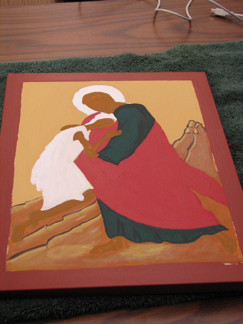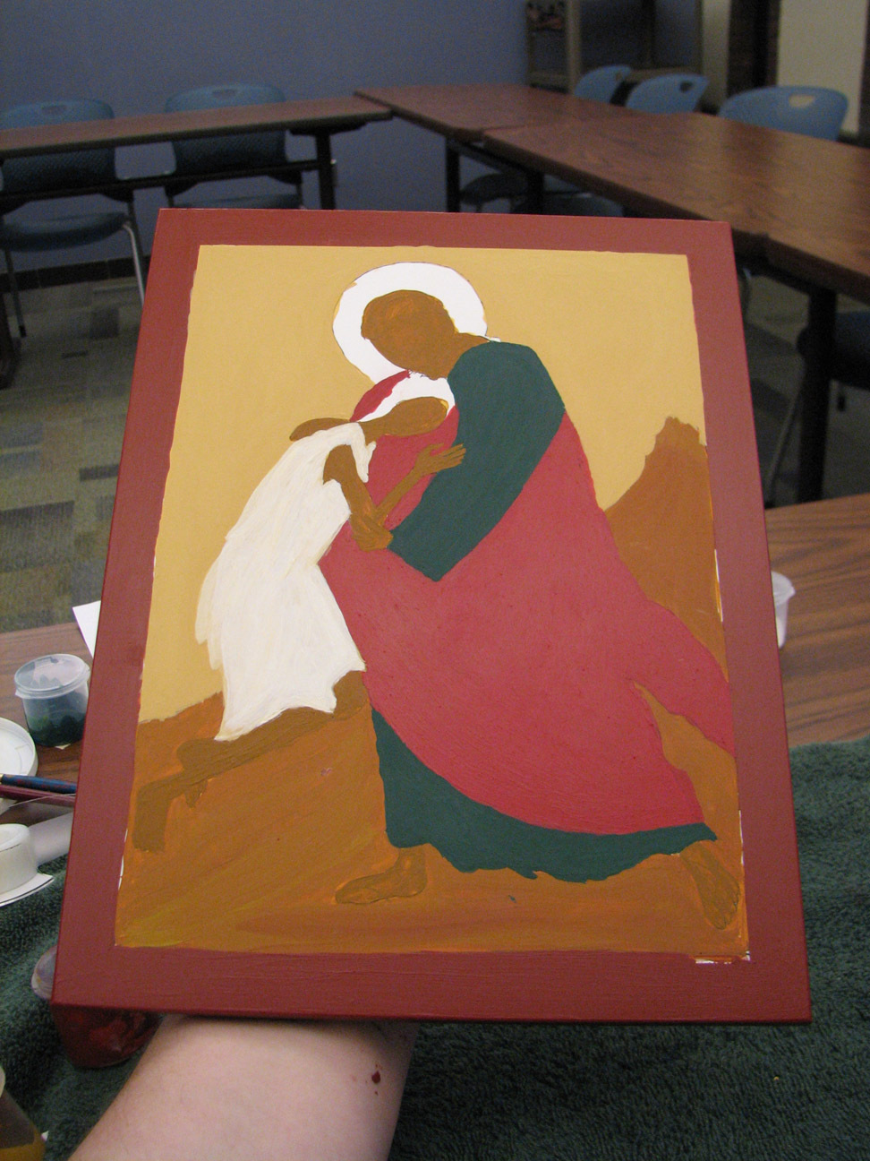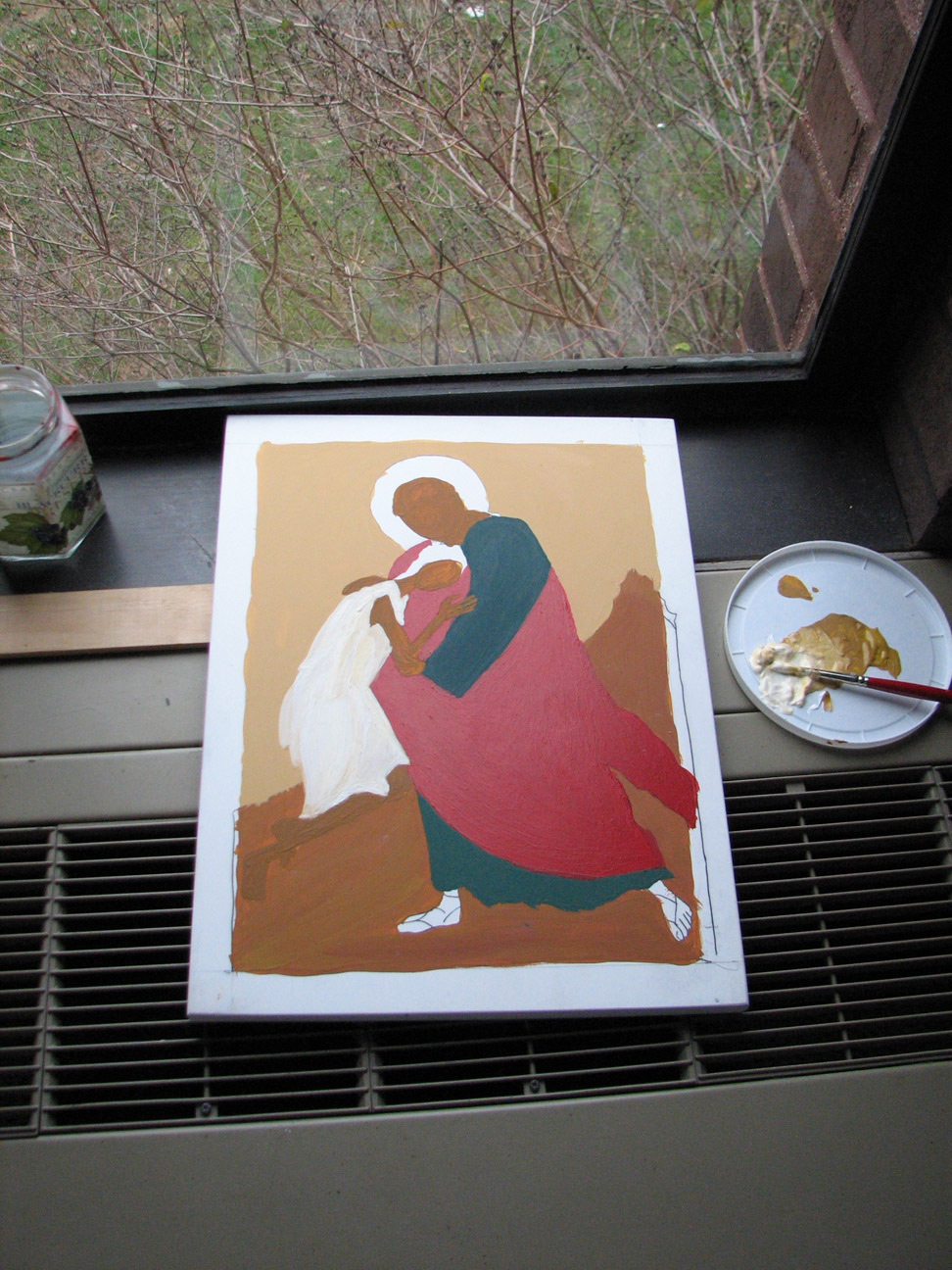 Iconography that resembled any kind of ancient forms and rigid traditions was the furthest thing from my mind six weeks ago. In the course of painting, or "writing" an icon of the parable of the prodigal son, I formed a profound and unexpected intimate relationship with an inanimate object. I assumed we'd be learning about the process of iconography from a theological and historical perspective, and then be required to complete a project that resulted in an icon-like object, maybe write a paper. I was prepared to output something with my well-practiced skills in the trinity of technique, appearance, and product. How naive! It's also naive to forget that, even in my cynical moments, behind that trinity stands the original, most holy. In any case, time and mystery and spirit won out, using technique, appearance, and product in the service of higher and sometimes confounding purposes which I grasp now dimly.