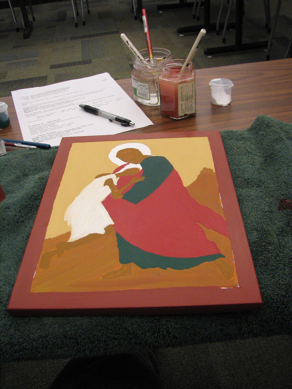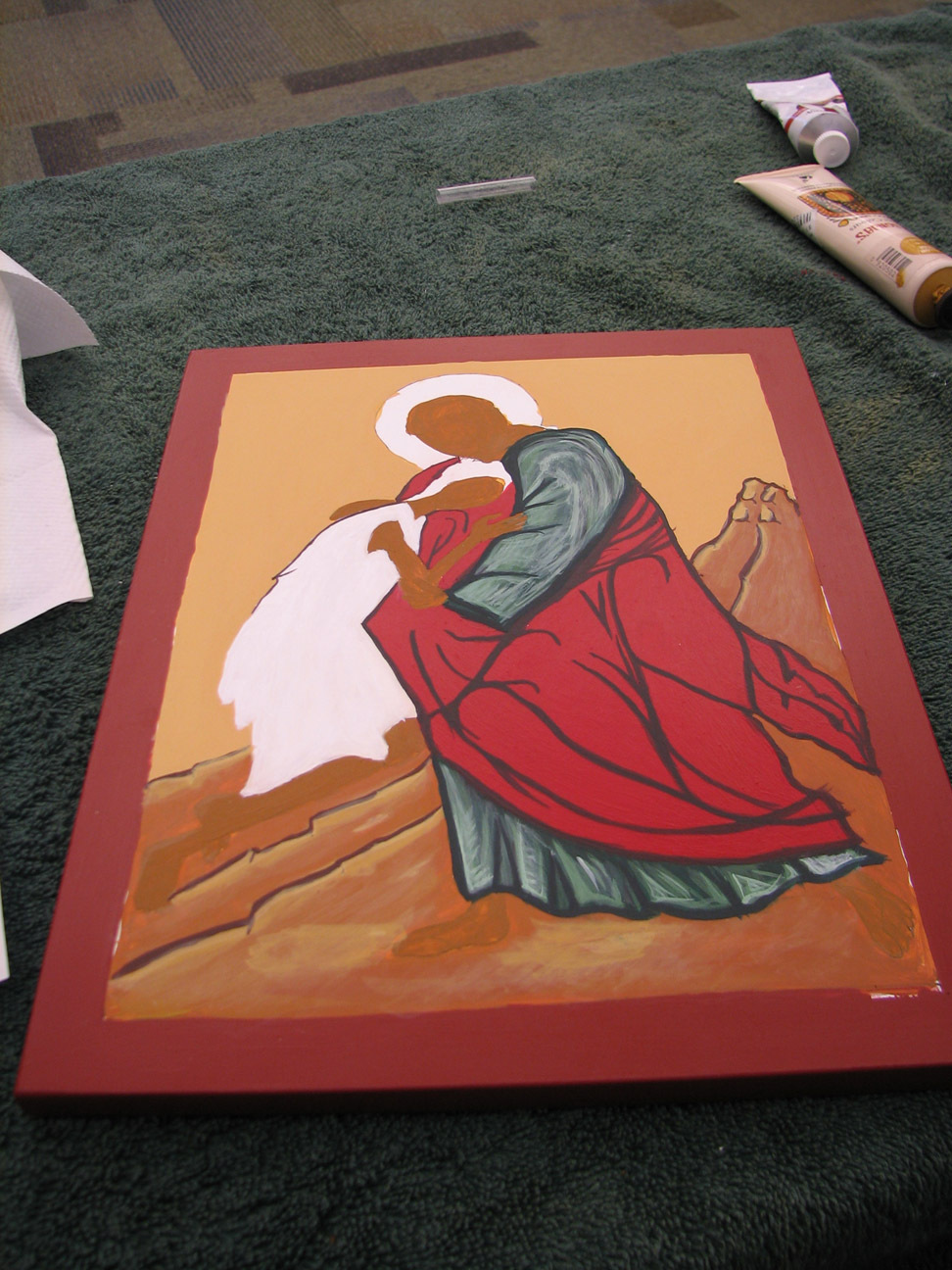 red robe folds added, and some lightening of the green robes. here the paint was probably supposed to be more transparent. I like to think of my paint opacity problems as both a novice's shortcomings and a heterodox Lutheran's better features. If you have to ask, you probably don't care.