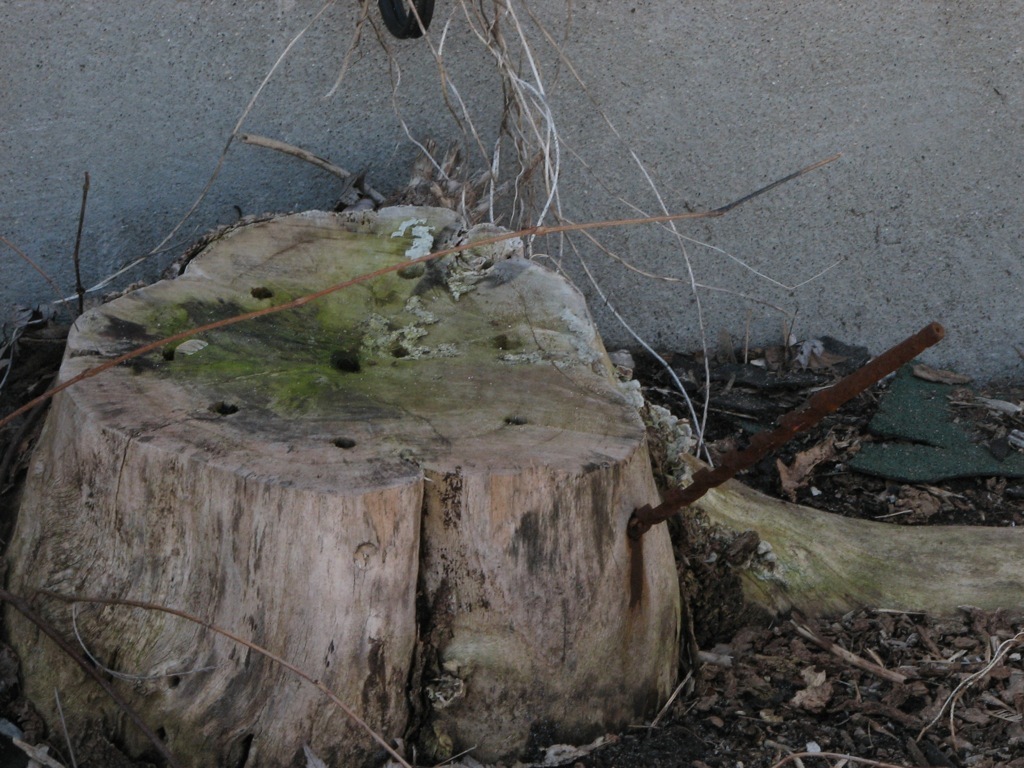 . . . in case you're wondering, that rusty looking thing is a DRILL BIT that's about 16 inches long. Burn Unit was drilling holes in the stump (you can see some of them) last summer to get the dissolution process started. However the stump SEIZED the bit and we've been unable to extract it. THAT'S some *disobedience*