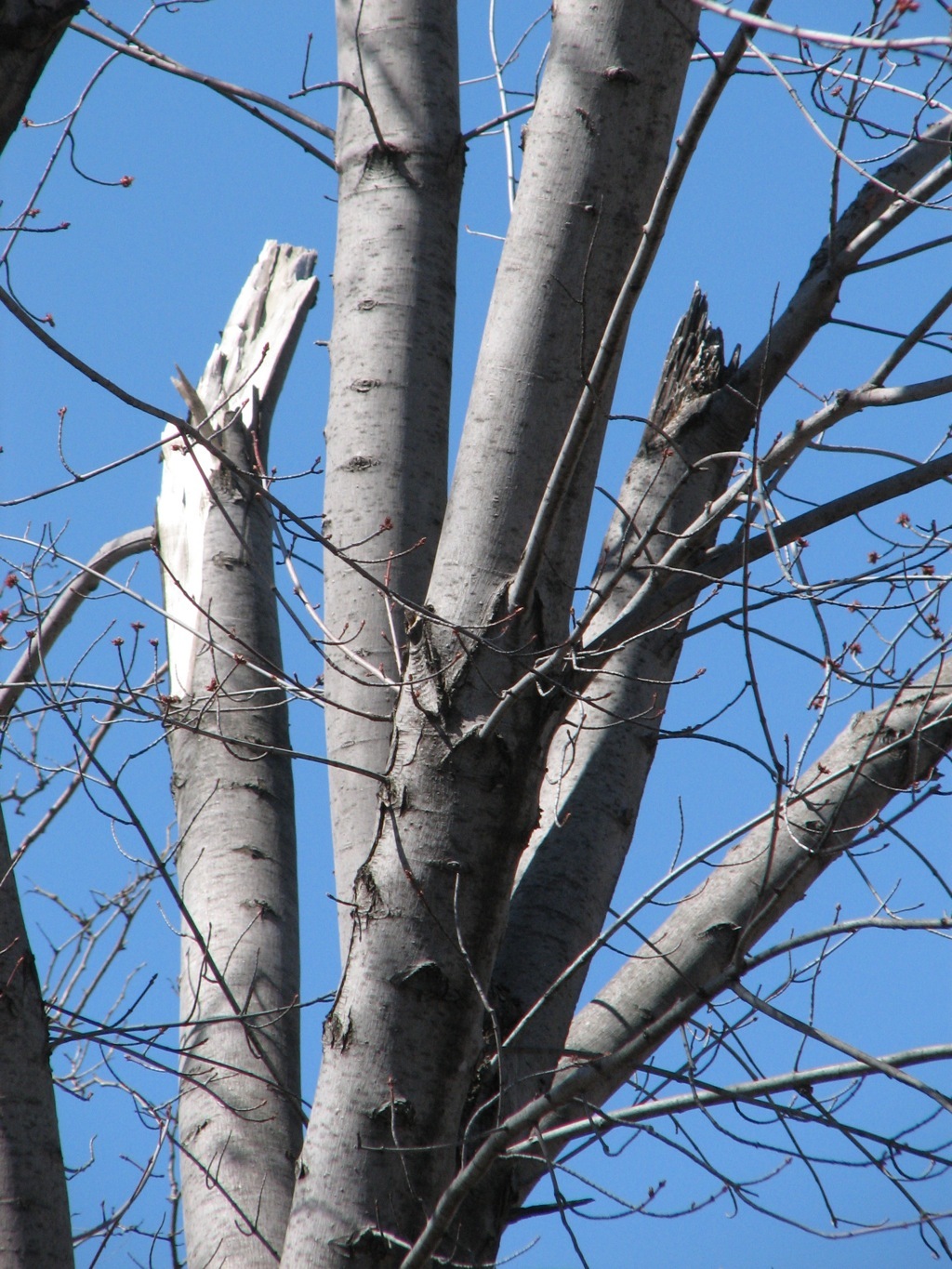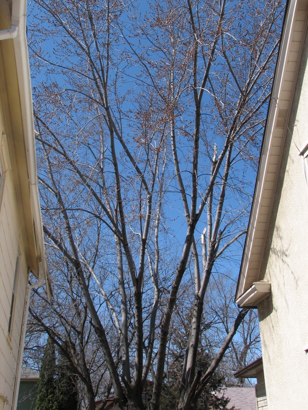 This enormous silver maple lives in our front yard. It overhangs the house--we trimmed it pretty big in 2005--occasionally LARGE LIMBS GET BLOWN OFF and crash into our yard or the neighboring yard.