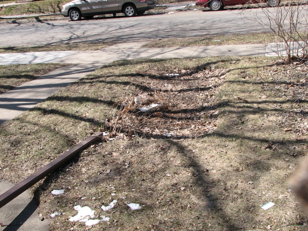 See that silt? That silt collects because of LOUSY DRAINAGE after winter, and a mud puddle sits there throughout winter and spring every year, often making our access to and from the car parked at the curb messy or perilous or both.