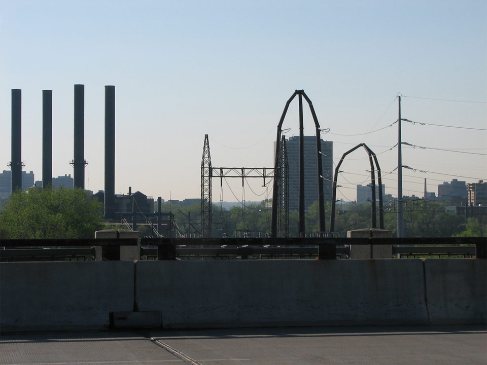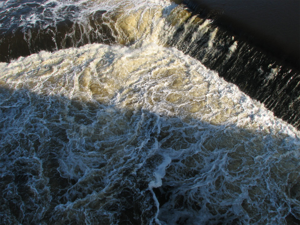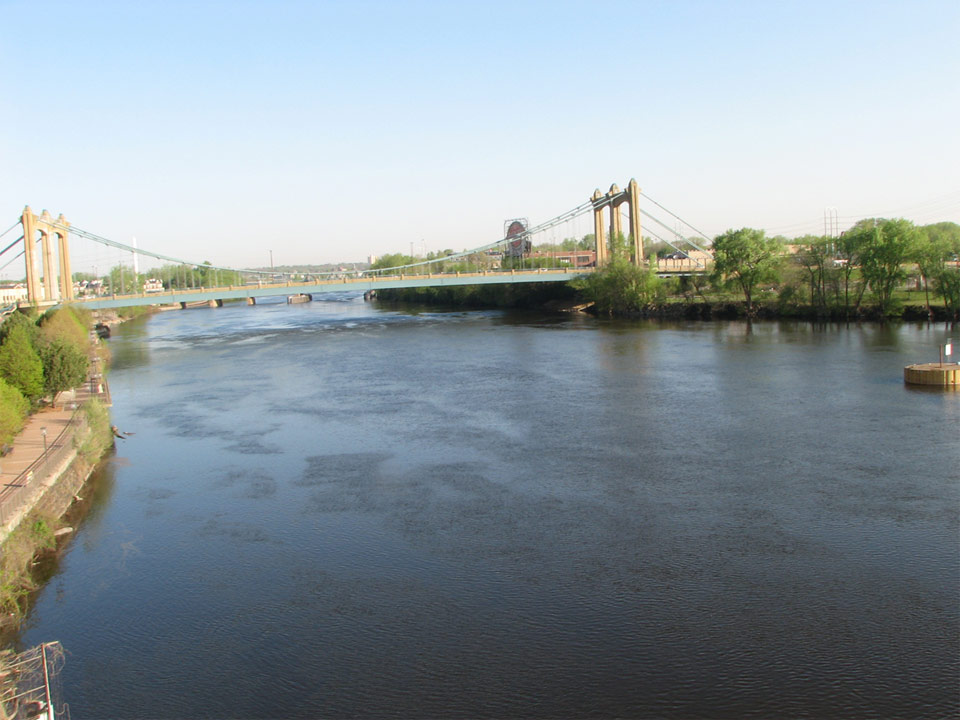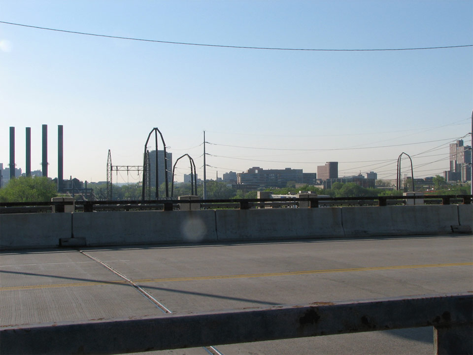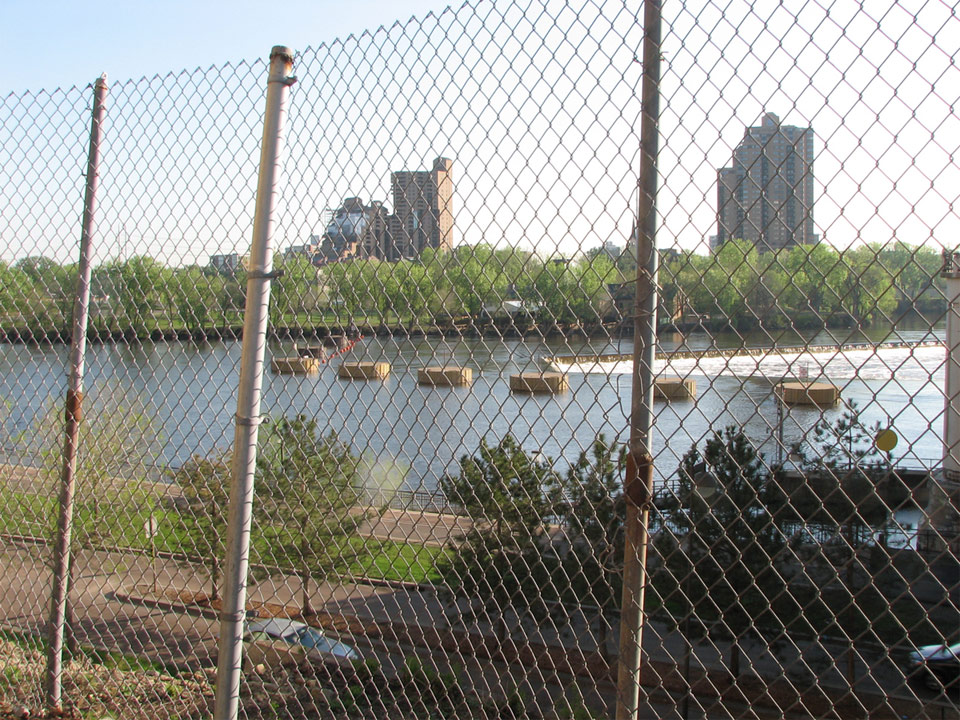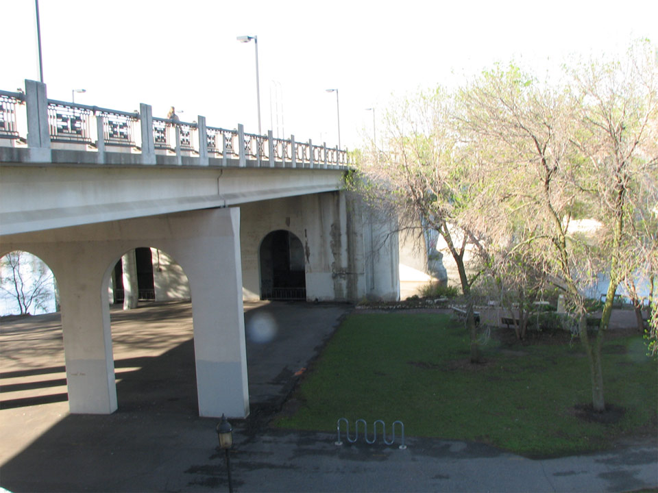 This is from one of the little cutout spots that curves out from the bridge proper, a kind of turnaround or scenic overlook. The full length and glory of the post office (that long sandstone building with the dark rectangular windows) is visible here, as are other features like the beginning of the falls/dam/locks.