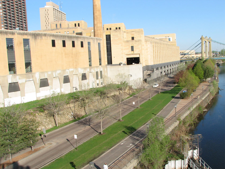 Mill City Museum is that chopped out building over there. The dark blue with the weird outcroppings and tall spire/stack behind the Gold Medal building is The Guthrie Theater, possibly the most titanic monolithic stage theater I've ever seen. It's awesome, yet frightening. This is a crazy-developing part of town right now.