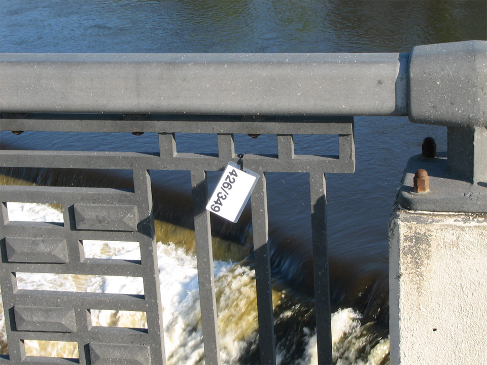 Here's one of the tags, zip tied to the bridge's metal. I got to thinking that people might be creeped out by these. People are silly that way. Too late, of course, I was halfway across!