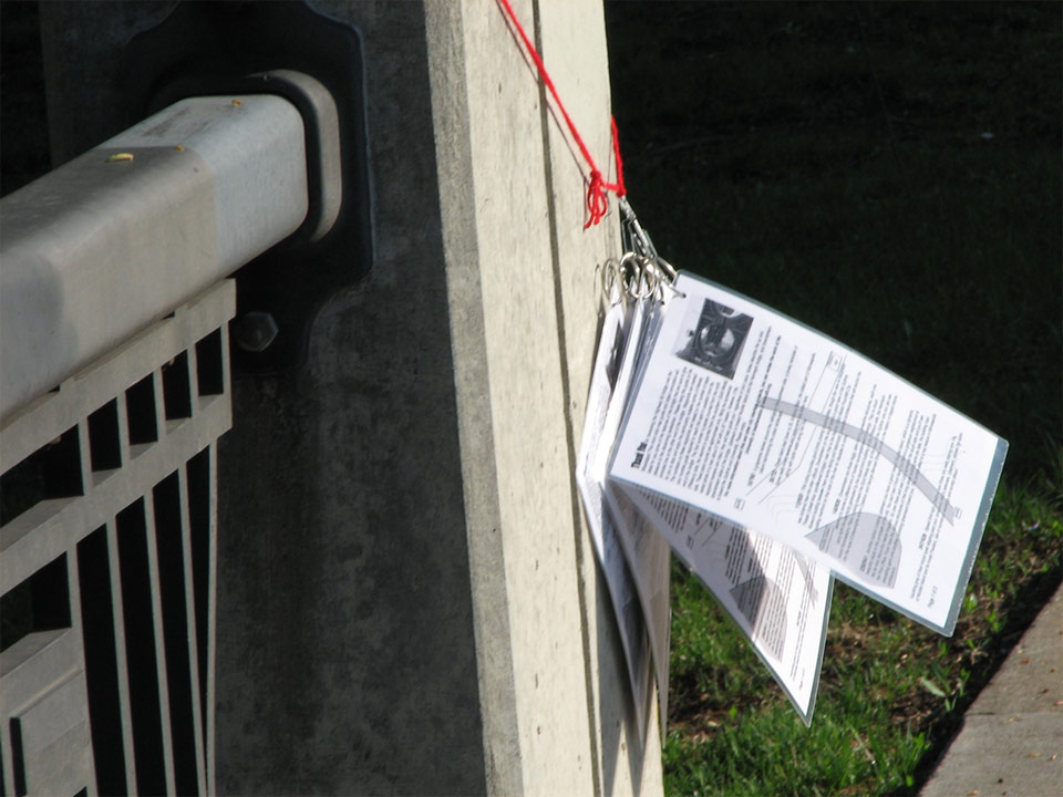 Here's the laminated maps with the ring binders (for ease of hanging) and the red thread. Just before I hung these, a late-middle-aged woman was walking by and I said "I've made a walking guide to the bridge! Would you like one?" The answer was, of course, a harsh "no!" and an accelerated stride.