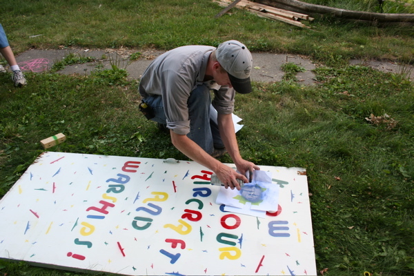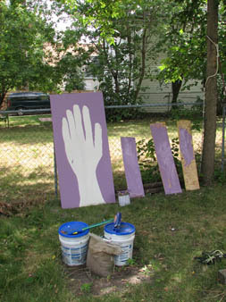 All in all, 10 sides of doors were lovingly painted with a variety of techniques and references, including a little SF-TC love, a lion contributed by one of Burn Unit's neighborhood friends, and plenty of touch ups from Eleanor, who was politely urged to please stay away from the henna-hand and stenciled doors. Days stretched into months and despite occasional positive exhortations from Lowteck (with whom Burn Unit had consulted back when there was a real possibility Doorhenge and The Doornaments would hit the praxis at the same time), there was little serious progress getting the damn things off the ground.