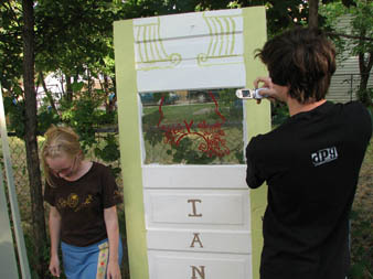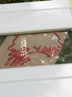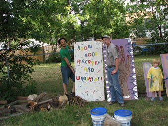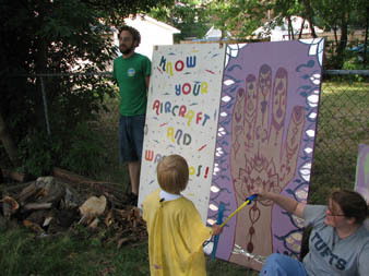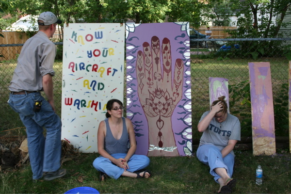 Well, they did some amazing decorations on the doors. Dan and Saul concocted this insane riff on a little child's "stenciled playroom," only with vintage aircraft and warships (along with patriotic exhortation for the little tykes). Dan's sister looked past the flat white closet door and saw a beautifully hennaed hand, auspiciously gilt in silver. Two more friends took Burn Unit's vague mutterings about "Janus the two faced god of doorways" and produced a beautiful rendering of Janus' visage on a window, and appropriately classical columns on the door. Burn Unit and Eleanorest kept tabs on the other stuff, lending their much less refined efforts to finish things off.