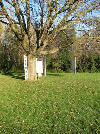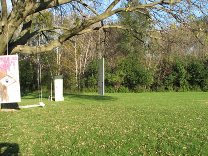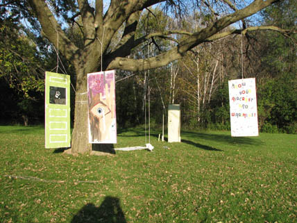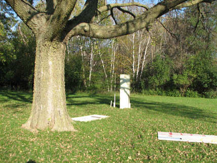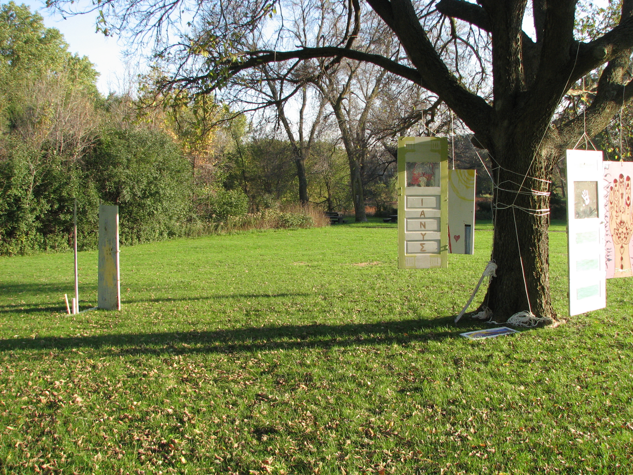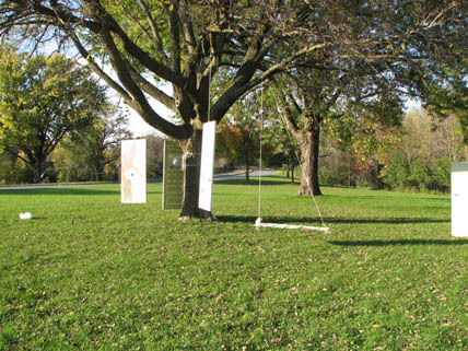 When this all started, Burn Unit had a trash-bound door left over from a house renovation project. The original plan was to build a freestanding frame and run out to a location, like Lyndale Avenue over by The Walker, and stand that door up right around rush hour. The freestanding frame was designed to be lightweight, fast and easy to stake down. It would have fulfilled the task, and given "early-mover advantage" in the horse race for points. But then Burn Unit realized he had more than the one door and a vision struck: a more aesthematic vision of beautiful doors hanging beautifully from the limbs of a great tree. He kept seeing these trees along the parkways of the Twin Cities which cried out to be decorated. He also realized he had more than the one door, if he'd just do some of the other projects around the house, like ripping out those sliding closet doors in the back bathroom, taking the old old doors off the front and back...Hm. Suddenly Doortopia Gardens didn't sound like such a remote possibility...