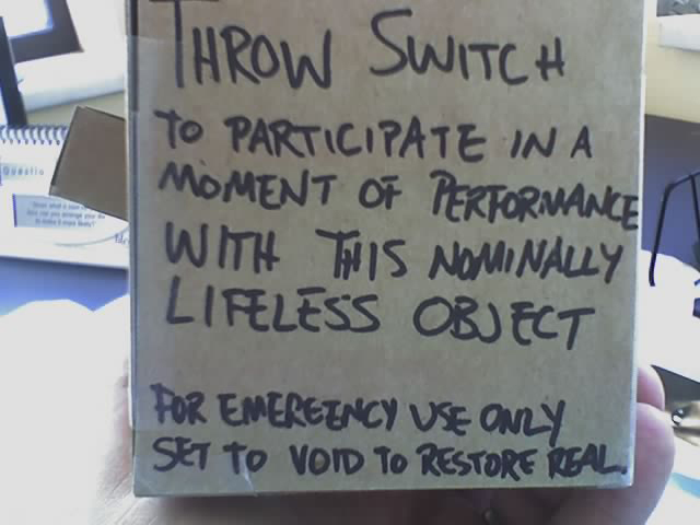 Right side reads "Throw switch to participate in a moment of performance with this nominally lifeless object for emergency use only set to void to restore real" I figure people should know where they stand if they flip that switch!