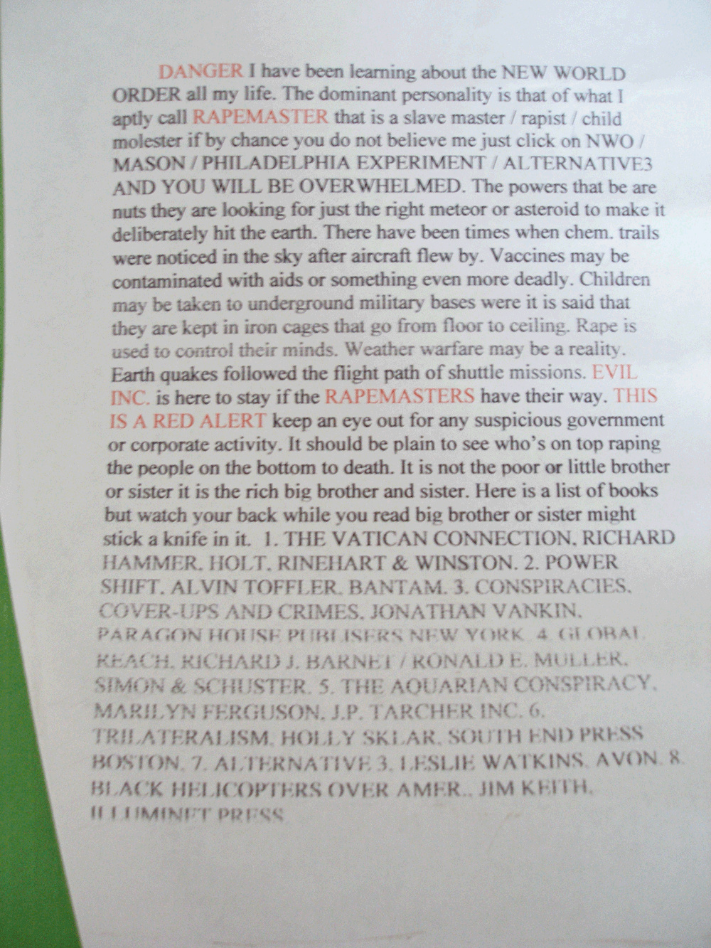 "DANGER I have been learning about the NEW WORLD ORDER all my life. The dominant personality is that of what I aptly call RAPEMASTER that is a slave master / rapist / child molester if by chance you do not believe me just click on NWO/MASON/PHILADELPHIA EXPERIMENT/ALTERNATIVE3 AND YOU WILL BE OVERWHELMED. The powers that be are nuts they are looking for just the right meteor or asteroid to make it deliberately hit the earth. THere have been times when chem. trails were noticed in the sky after aircraft flew by. Vaccines may be contaminated with aids or something even more deadly. Children may be taken to underground military bases were it is said that they are kept in iron cages that go from floor to ceiling. Rape is used to control their minds. Weather warfare may be a reality. Earth quakes followed the flight path of shuttle missions. EVIL INC. is here to stay if the RAPEMASTERS have their way. THIS IS A RED ALERT keep an eye out for any suspicious government or corporate activity. It should be plain to see who's on top raping the people on bottom to death. It is not the poor or little brother or sister it is the rich big brother and sister. Here is a list of books but watch your back while you read big brother or sister might stick a knife in it. 1. THE VATICAN CONNECTION, RICHARD HAMMER, HOLT, RINEHART & WINSTON. 2. POWER SHIFT, ALVIN TOFFLER, BANTAM. 3. CONSPIRACIES, COVER-UPS AND CRIMES, JONATHAN VANKIN, PARAGON HOUSE PUBLISHERS NEW YORK. 4. GLOBAL REACH, RICHARD J. BARNET / RONALD E. MULLER, SIMON & SCHUSTER. 5. THE AQUARIAN CONSPIRACY, MARIYLN FERGUSON, J.P. TARCHER INC. 6. TRILATERALISM, HOLLY SKLAR, SOUTH END PRESS BOSTON. 7. ATERNATIVE3, LESLIE WATKINS, AVON. 8. BLACK HELICOPTERS OVER AMER., JIM KEITH, ILLUMINET PRESS."