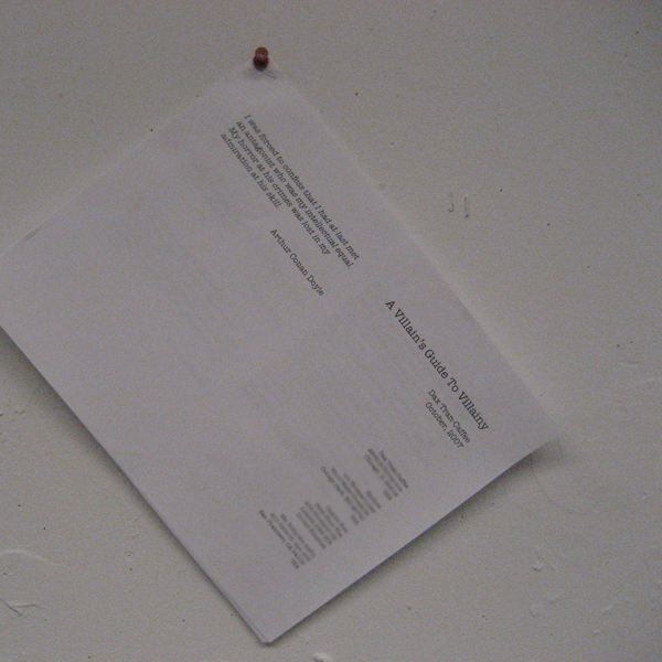 I have completed the task "Destruction Manual" as of October 31st, 2007, by composing a text entitled "A Villain's Guide to Villainy." I do not intend to post proof of this task completion, as the contents of the Manual must not be presented to the SFØ public.
