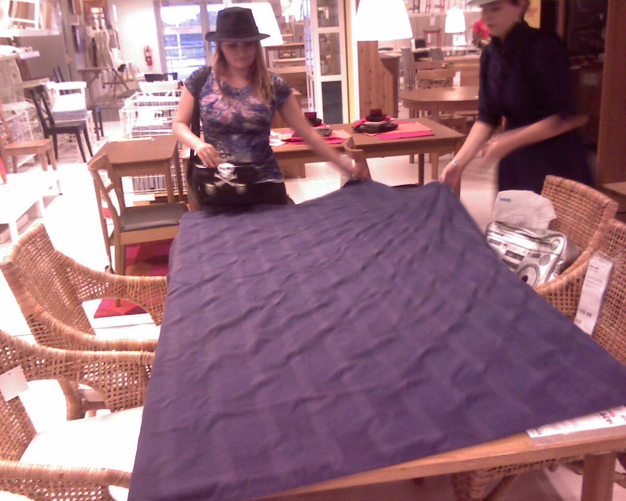 Now, we knew that inevitably someone would come to inquire as to our purpose in spreading a tablecloth and dishes all over their displays, but I personally didn't expect what was to come.Of course we might have known we'd be quickly caught if any of us had noticed the cleverly concealed customer service station less than three feet from our perfect table.