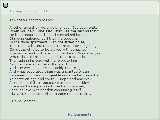 Here's a nice example of my writing circa 2003. Ugh. Deleted.